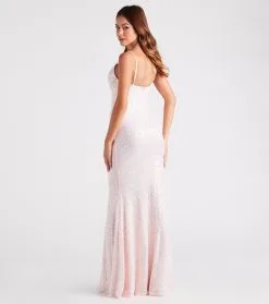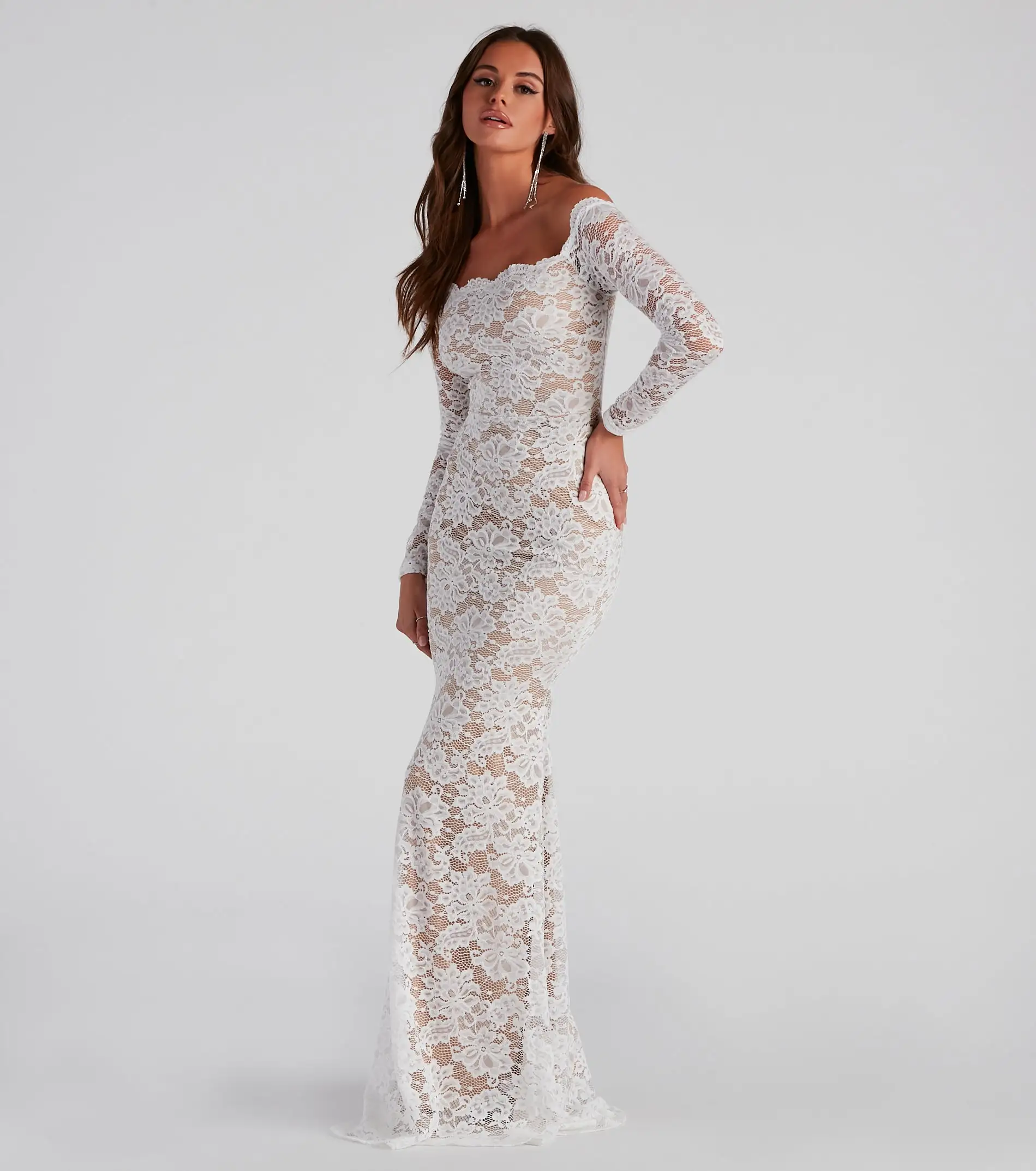 Make a grand entrance in a formal dress that reveals sophistication and elegance! Liesel features a gorgeous off-the-shoulder neckline, long sleeves, a romantic floral lace pattern, and a high waist that leads to a flattering mermaid silhouette. Liesel is composed of lace fabric with a contrasting hued lining. The dress offers a form hugging fit with a moderate stretch. Complete look withÂ