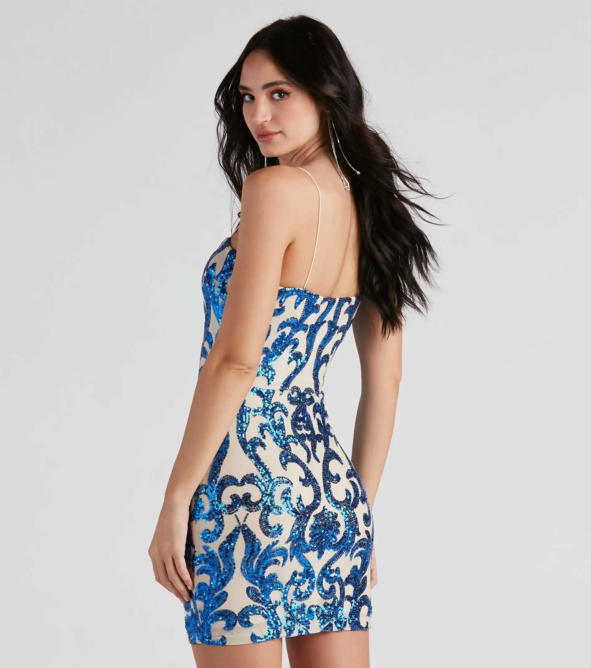 Hey babe, live it up and light up the dance floor in this stunning sequin mini dress! It features a sleeveless square neckline, bungee spaghetti straps, and a short, form-hugging silhouette. The sheer mesh fabric includes a full knit lining and has a chic all-over sequin scroll embroidered design. Complete the look with