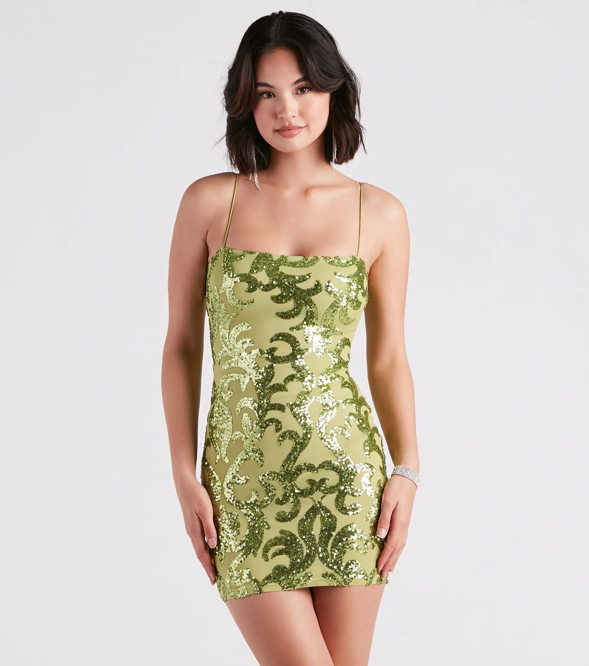 Hey babe, live it up and light up the dance floor in this stunning sequin mini dress! It features a sleeveless square neckline, bungee spaghetti straps, and a short, form-hugging silhouette. The sheer mesh fabric includes a full knit lining and has a chic all-over sequin scroll embroidered design. Complete the look with