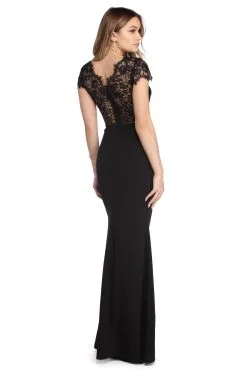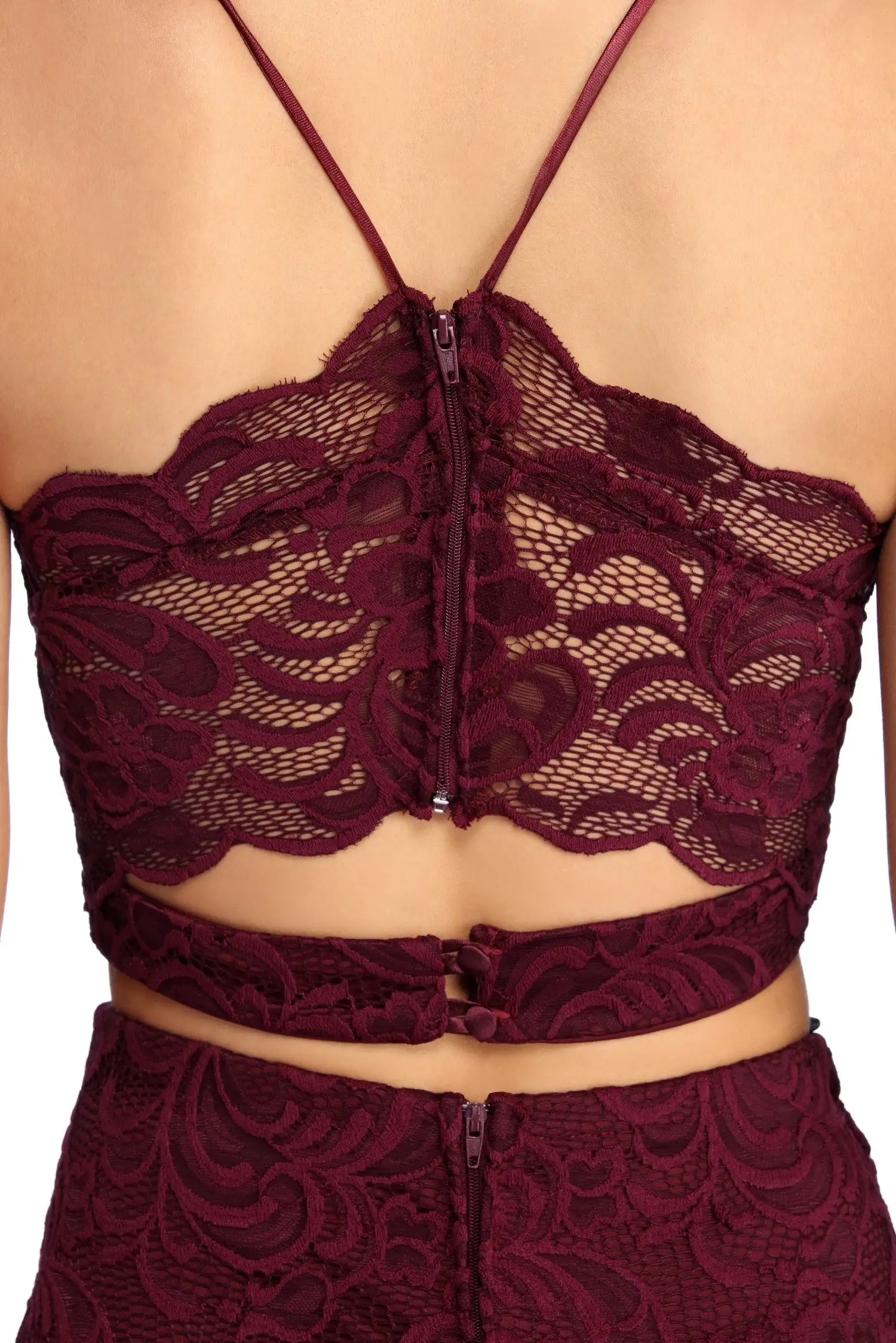 Bring the luxe in lace! Lottie features a burgundy hue and a trendy two piece design. Her crop top features a sleeveless bodice, a plunging V neckline, padded cups and narrow straps. Her back features an unlined floral lace panel and an open lower back with bar strap accent. Her matching skirt features a high rise waist and a high side slit. Dress offers a form hugging fit with a minimal stretch. Garment is composed of a lined lace fabric and includes back zipper closures.