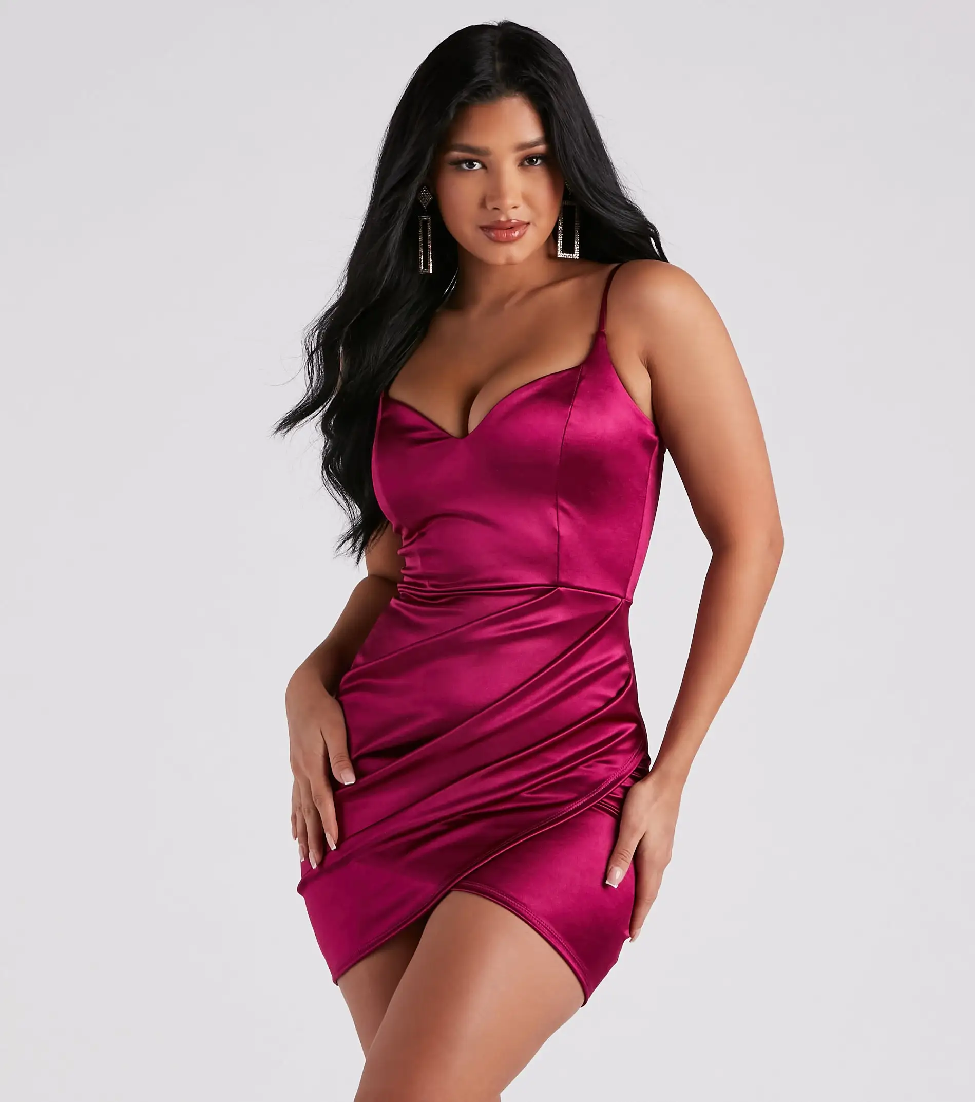 You’ll love to go out dancing in this satin short dress featuring a sleeveless V-neck, spaghetti straps, a princess seam bodice, bodycon fit, and a faux wrap asymmetrical hem with pleating. Complete the look in sassy