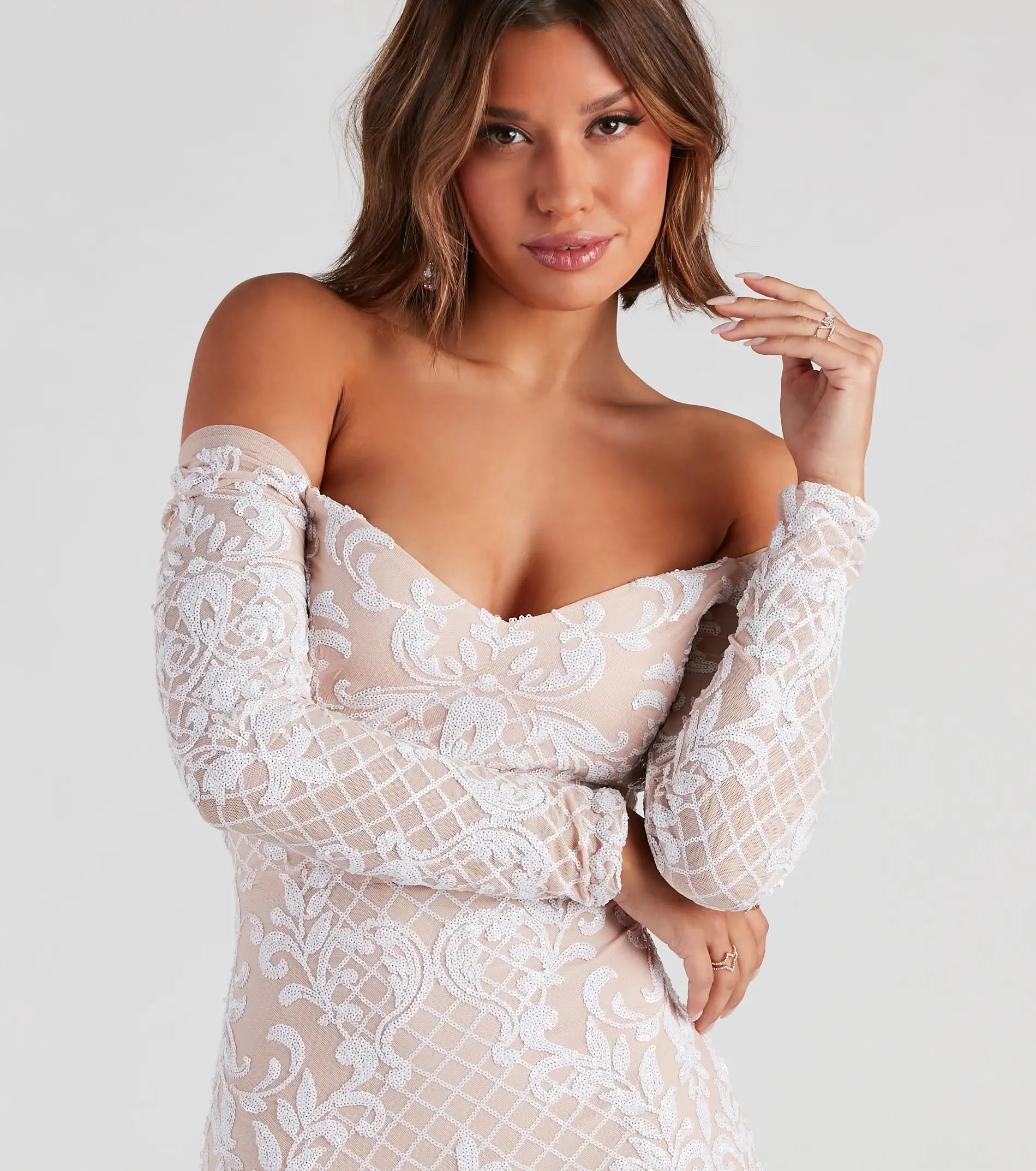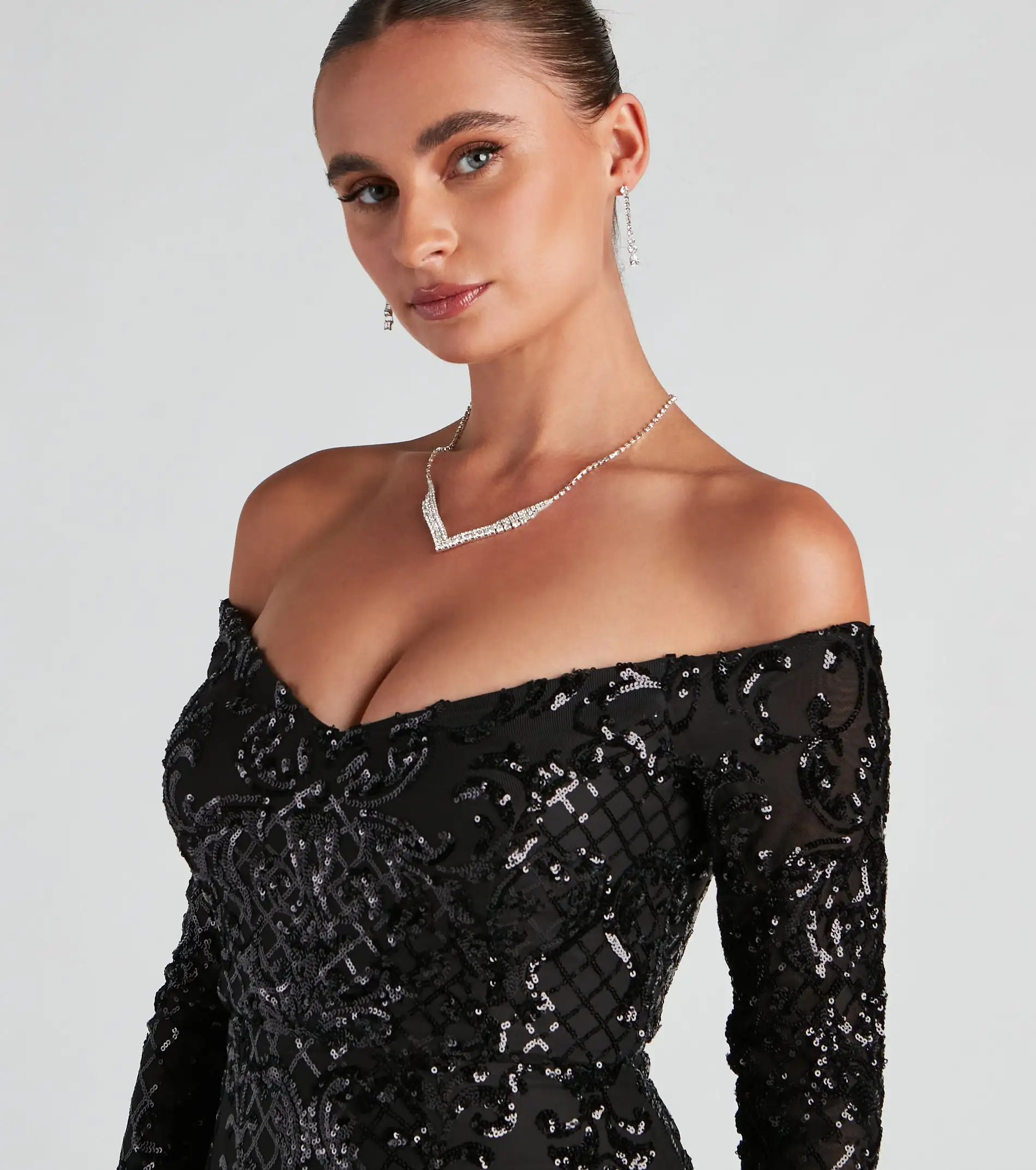 Channel the starry night sky in the Maddie party dress showcasing a memorizing sequin scroll embroidery sure to stun at homecoming! She features a classy, off-the-shoulder bodice, a V-neck accent, long sleeves, a high waist seam, and a short, curve-hugging silhouette. The formal dress is composed of a mesh fabric with a knit lining and minimal stretch. Complete your dressy look with a chic