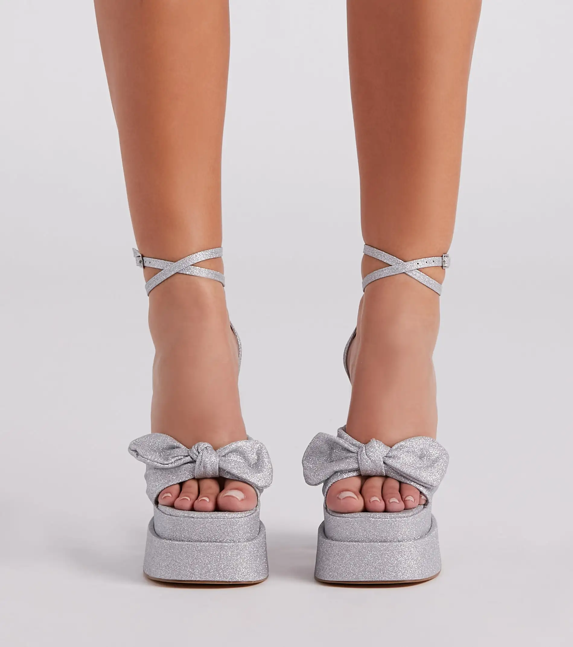 Show off major diva vibes in these totally fab glitter platform heels! They feature an open square toe, a wide toe strap with a cute bow accent, slim adjustable ankle and heel straps with criss-cross designs, a tall bold platform, and an ultra-tall block heel. The glitter mesh material will elevate the glam factor of your look. Style with a sleek