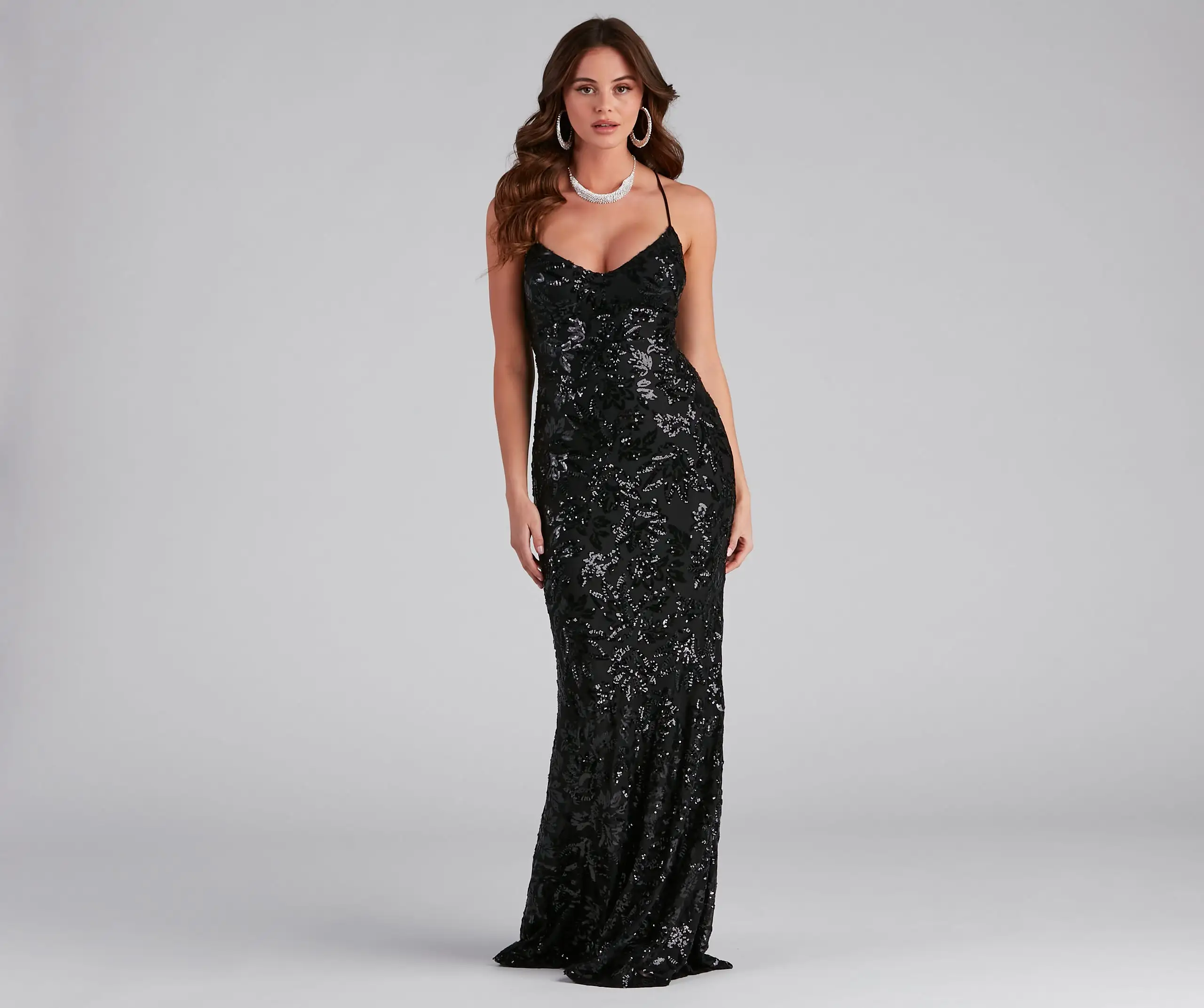 Light up the night with a formal sequin dress that elevates your special evening look. Marleigh features a dazzling damask sequin pattern, a sleeveless V-neckline, supportive padded cups, and spaghetti straps that lead to a cross-back strap design. Her back features a partially open design with tie-back straps. Her slim-fit bodice leads to a flared trumpet hem that brings the drama. Complete look with a sphere clutch and