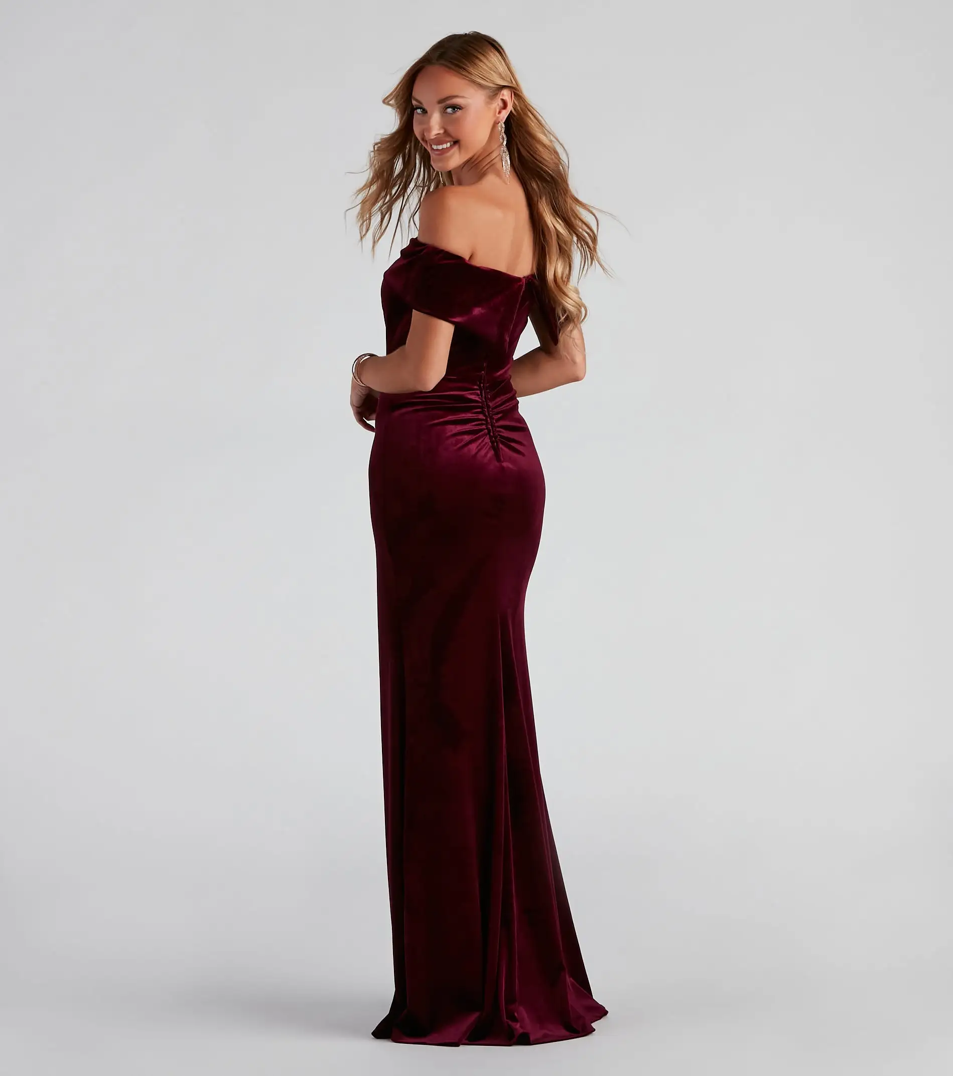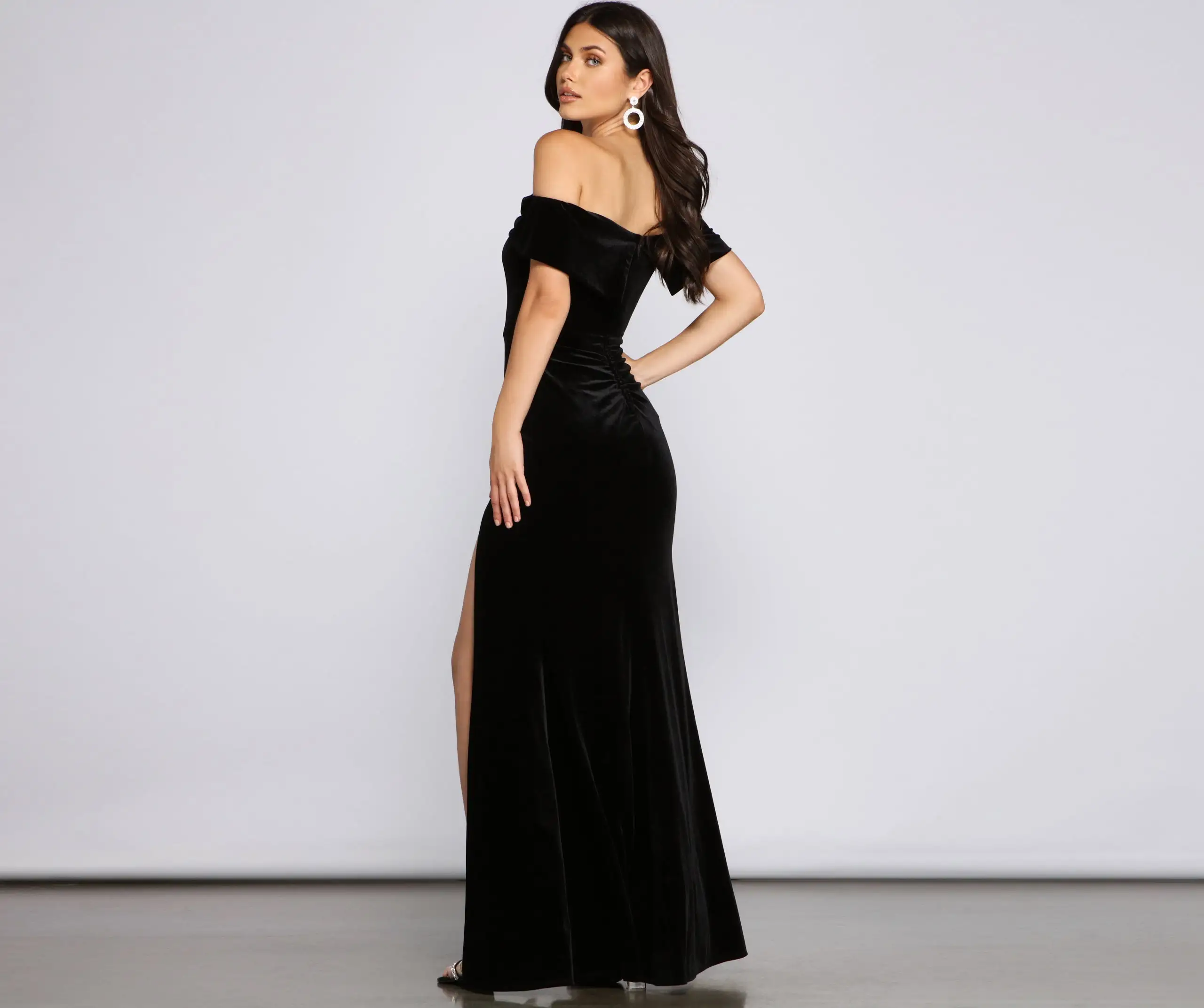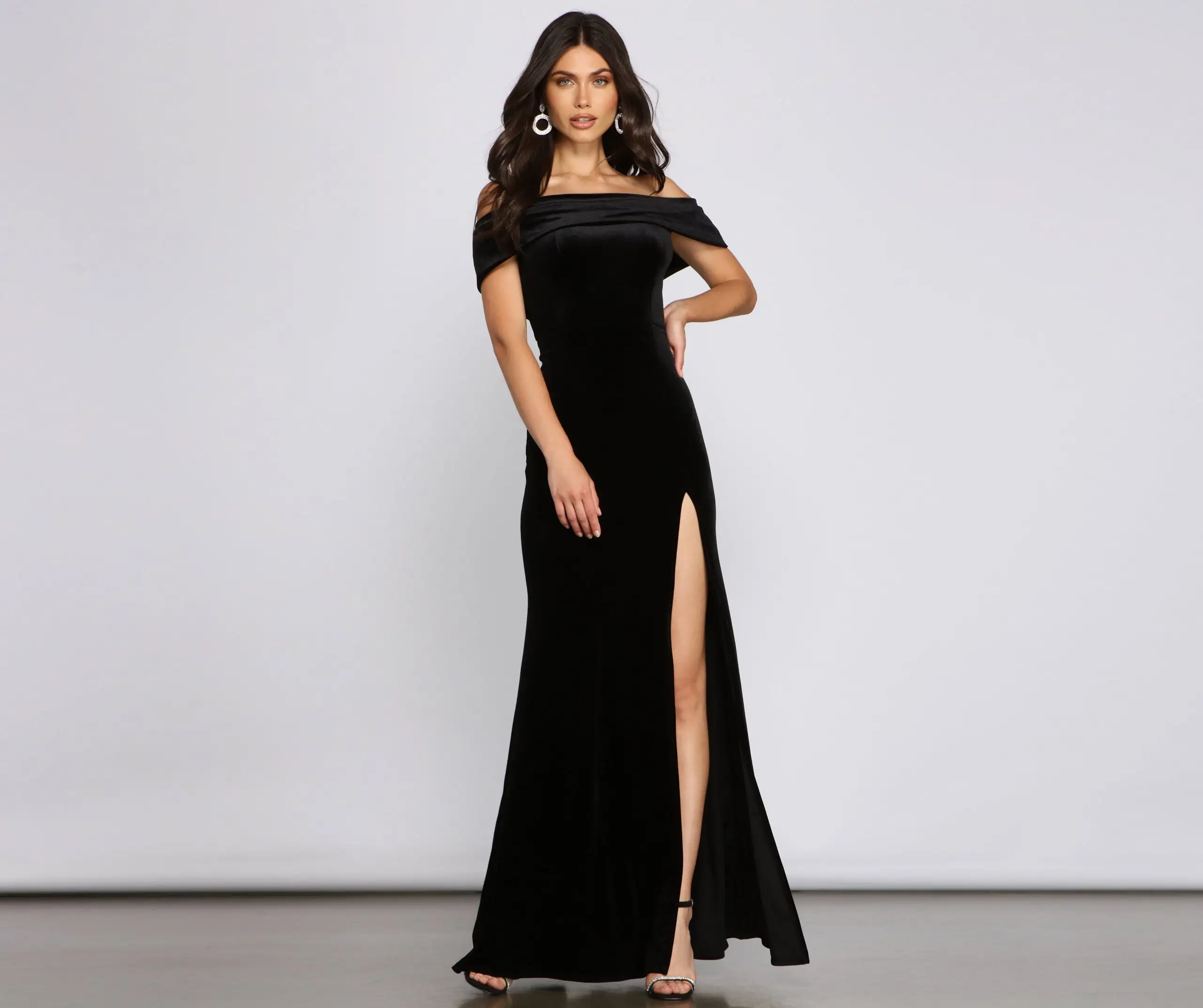 Capture all the attention in the room in this gorgeous long velvet dress! Olivia features a flattering off-the-shoulder neckline, a high side slit, and a curve-hugging fit. The dress is made from a form-fitting velvet material with a moderate stretch. Wear it with glimmering