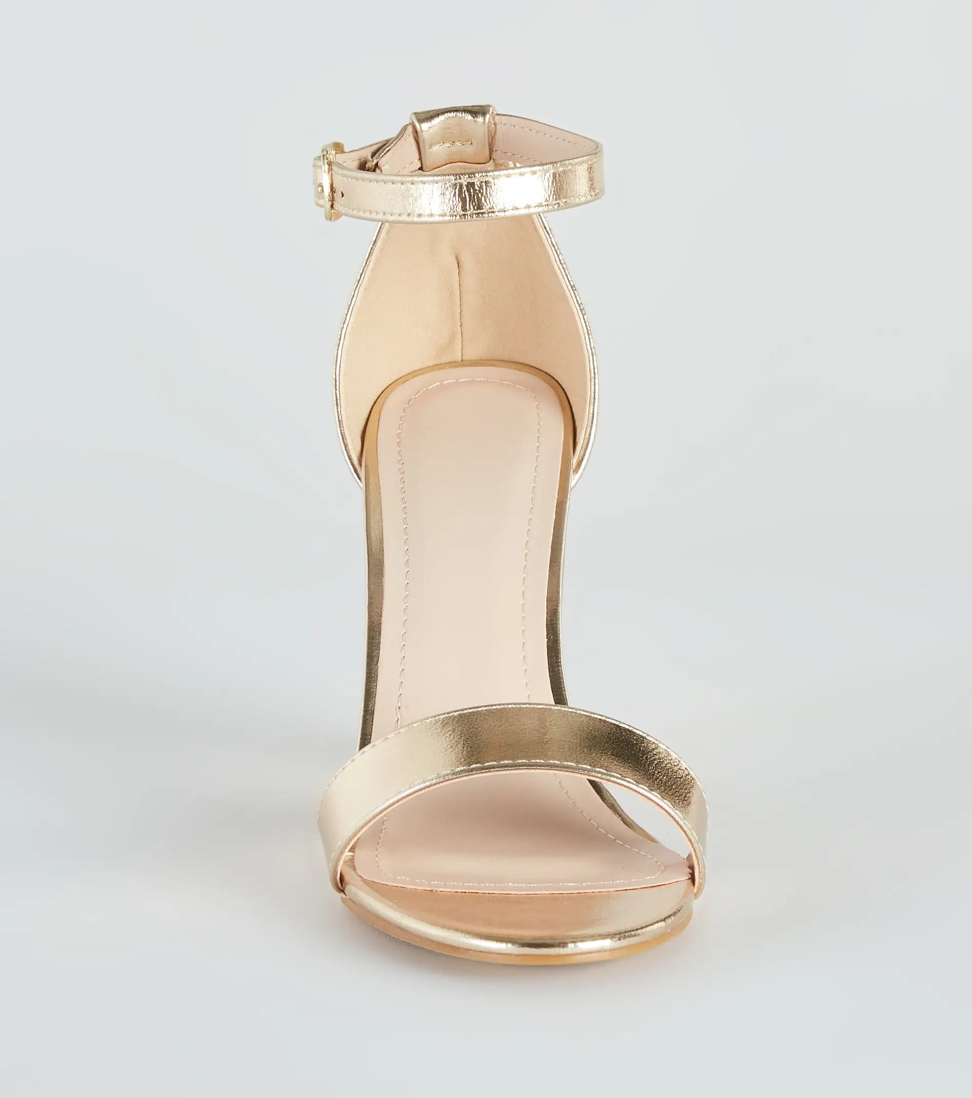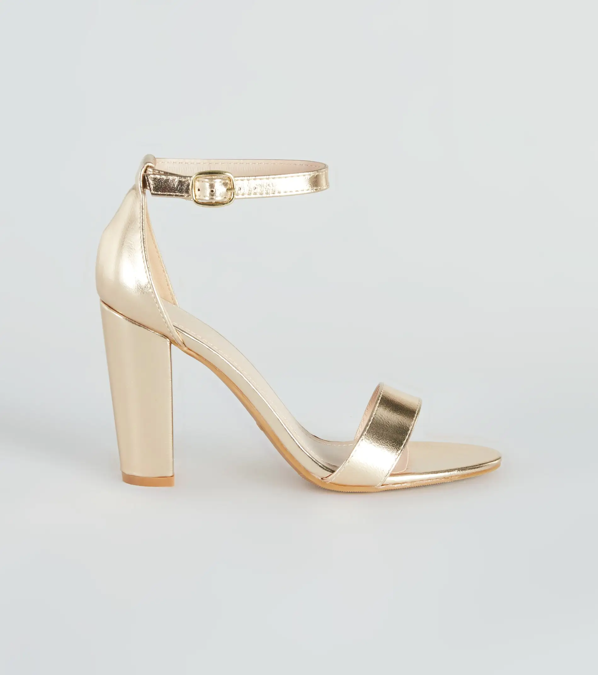 These metallic block heels are party ready! They feature an almond toe, a wide toe strap, a closed ankle with strap, and buckle closure, and a faux leather footbed. Complete the look with a chic