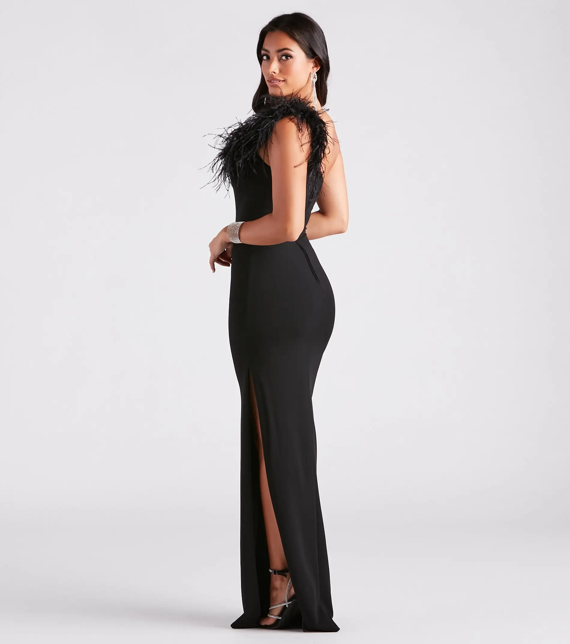 The Patricia formal crepe dress will make a memorable entrance for a bride, graduate, or black-tie guest! She features a sleeveless one-shoulder neckline with a marabou trim shoulder strap, a slim curve-hugging silhouette, a stunning high-side slit, and a long hem. The formal dress is composed of a sleek crepe fabric. Complete the look with