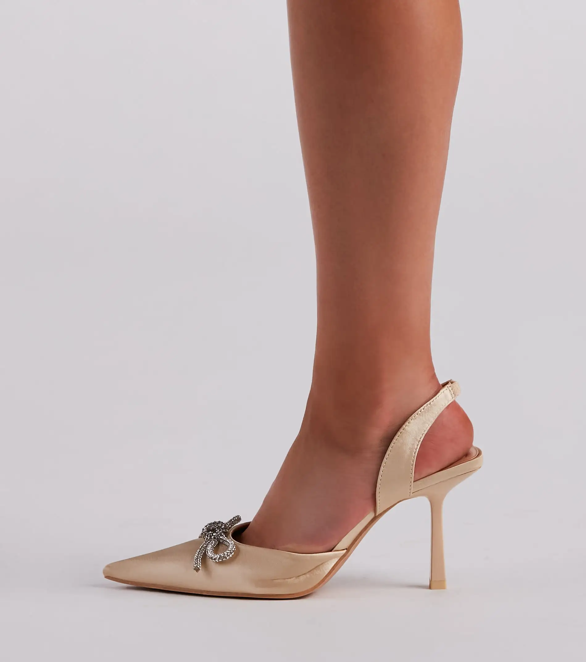 Gift yourself these perfect satin pumps for elevating your cocktail or formal wear! They feature a closed pointed-toe with a rhinestone bow, an open square-shaped back with an ankle strap, and a short stiletto heel. Style with a sparkly