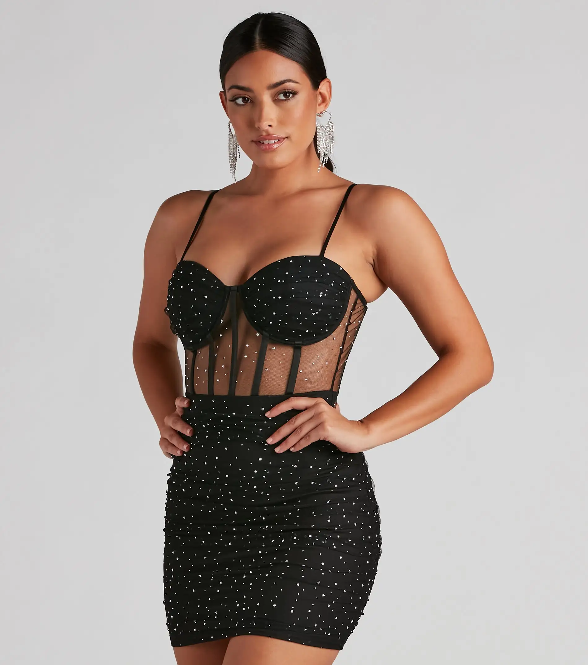 Show your effortless shine in this sparkly mesh mini dress designed with all-over heat stone embellishments for the perfect glow! This dress features a sleeveless, sweetheart neck, adjustable spaghetti straps, built-in padded bust with underwire support, a sheer illusion corset bodice with flexible boning, and a curve-loving silhouette. Complete the look in statement