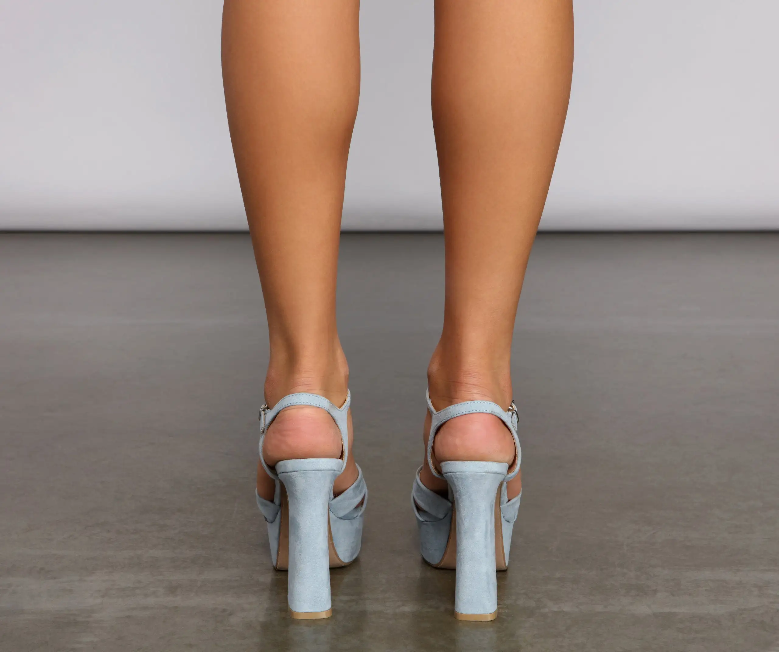 Raise the bar with platform heels that slay your look. The heels feature an adjustable ankle strap, criss-cross straps at the toe, an open almond toe, a wide platform, and a block heel. The heels are composed of a faux suede material. Complete the look with a