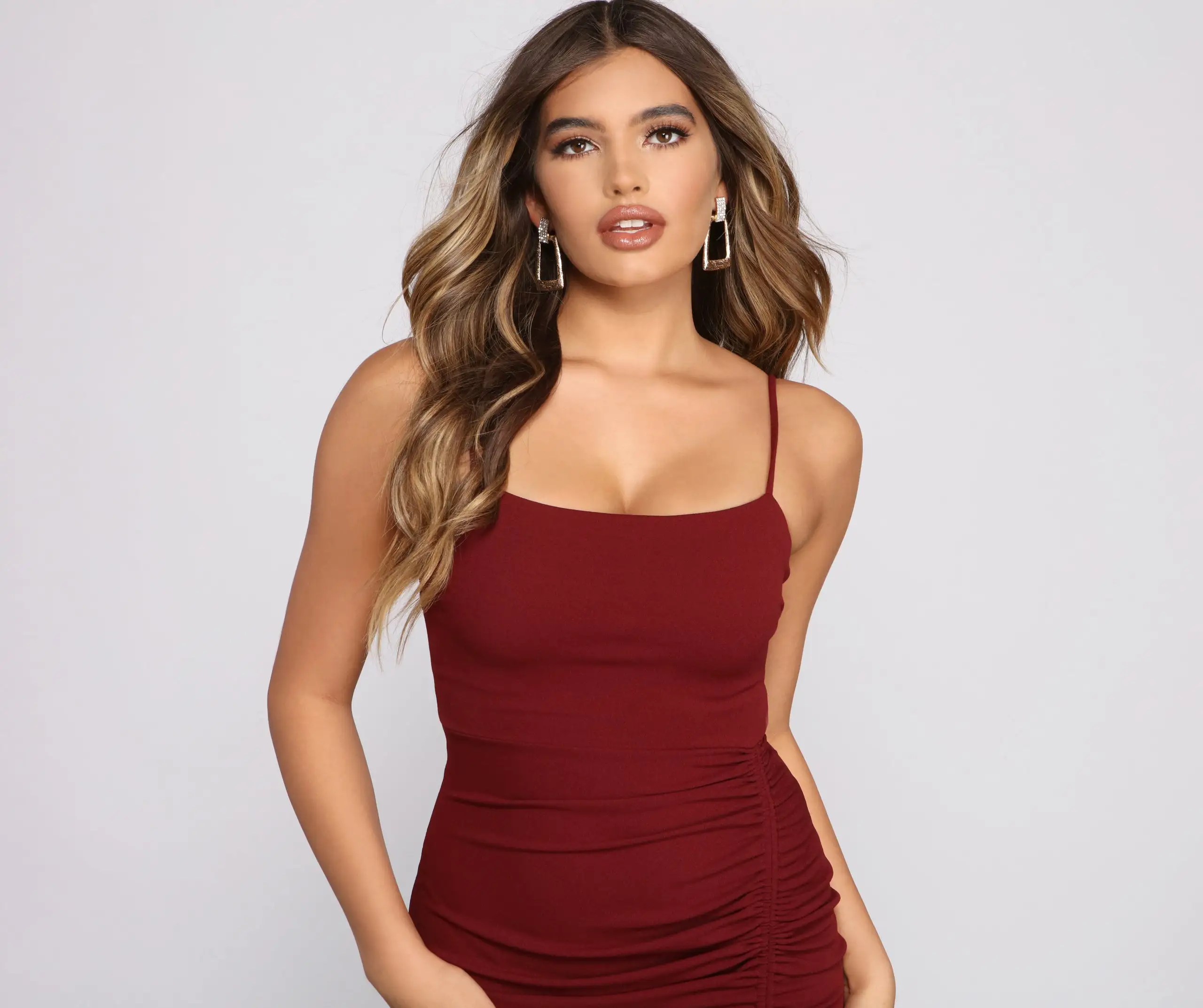 Get ready to style it up in this adorable ruched mini dress! It features spaghetti straps with a flattering square neckline, front ruched detailing with a tie at the hem, and a mini-length, curve-hugging fit. Pair this dress with some clear slide-on mules and a