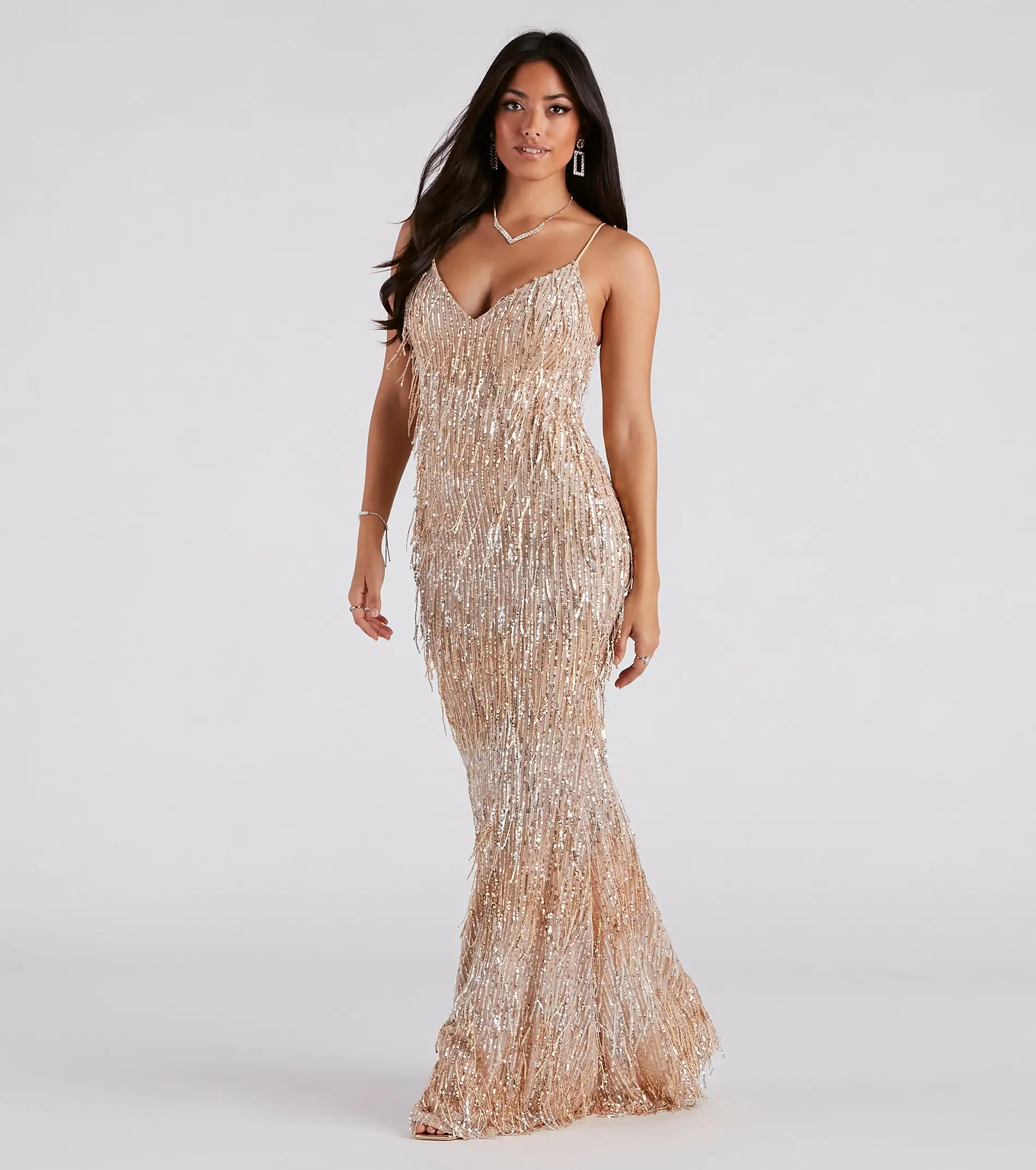 There’s something about the way you’ll look in the Rebekah formal sequin dress for your fearless-inspired era! Perfect for school dances, weddings, and galas. She features a striking sleeveless V-neckline, adjustable spaghetti straps, a padded bust, and a figure-flattering mermaid silhouette with a floor-length hem. The formal dress is composed of a glitzy sequin fringe embellished mesh fabric with a stretchy knit lining. Complete the look in