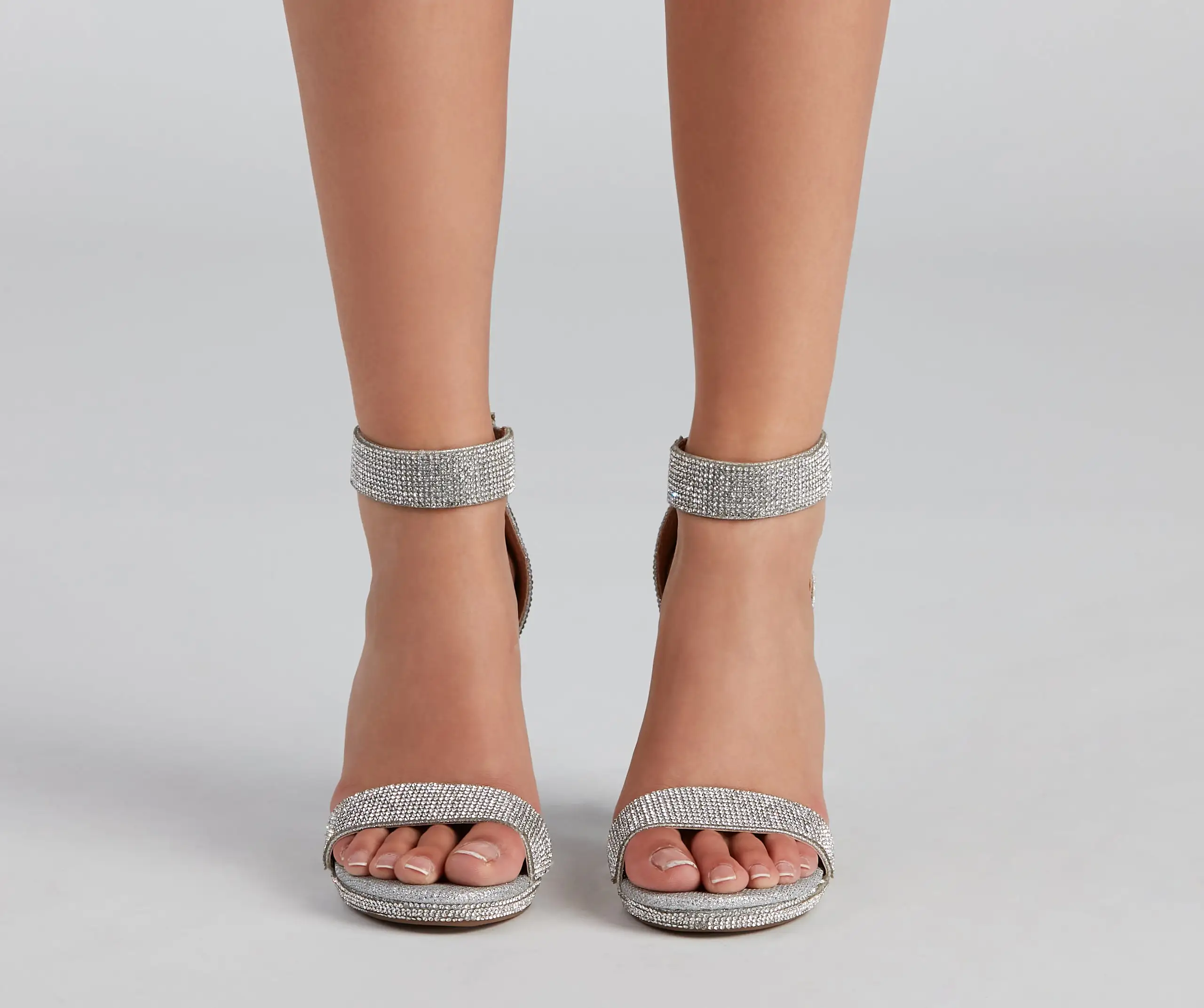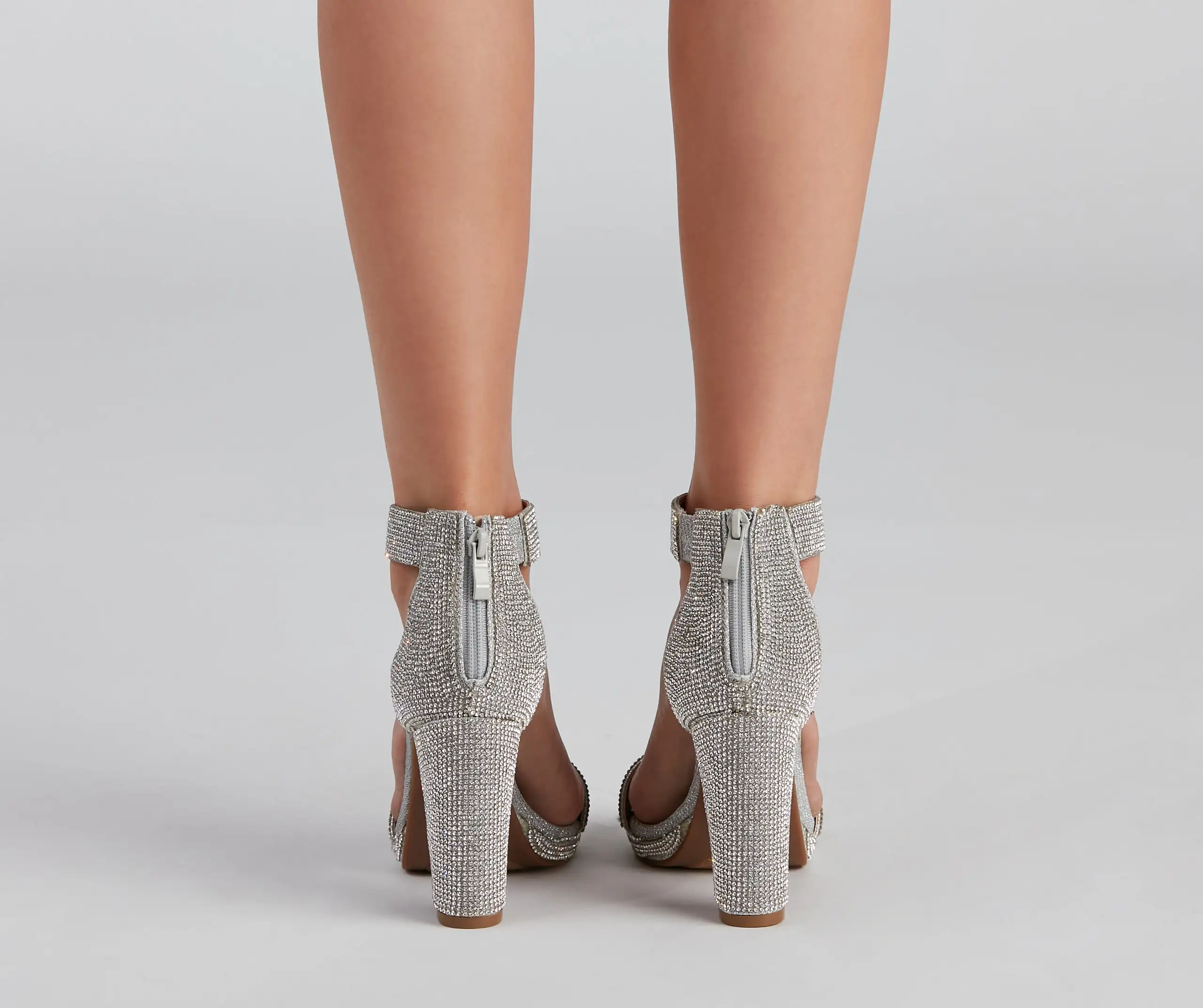 Bring the sparkle and shine to your special occasion look with these rhinestone block heels! These gorgeous sparkly heels feature an open-toe design with a stylish ankle strap and a zipper closed-back block heel. The all-over rhinestone embellished design will add a major sparkle to your party dress or formal gown look. Complement your rhinestone heels with matching