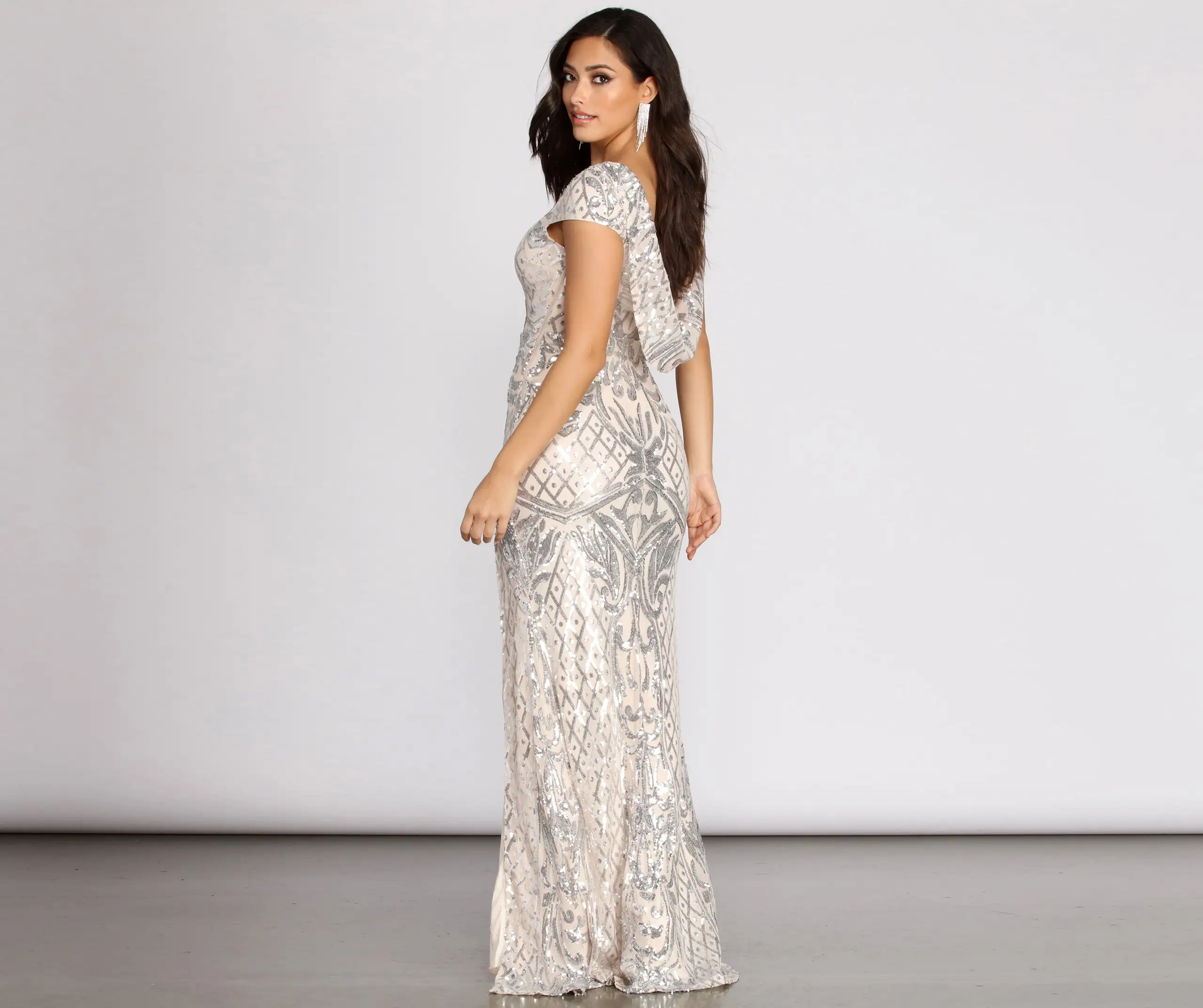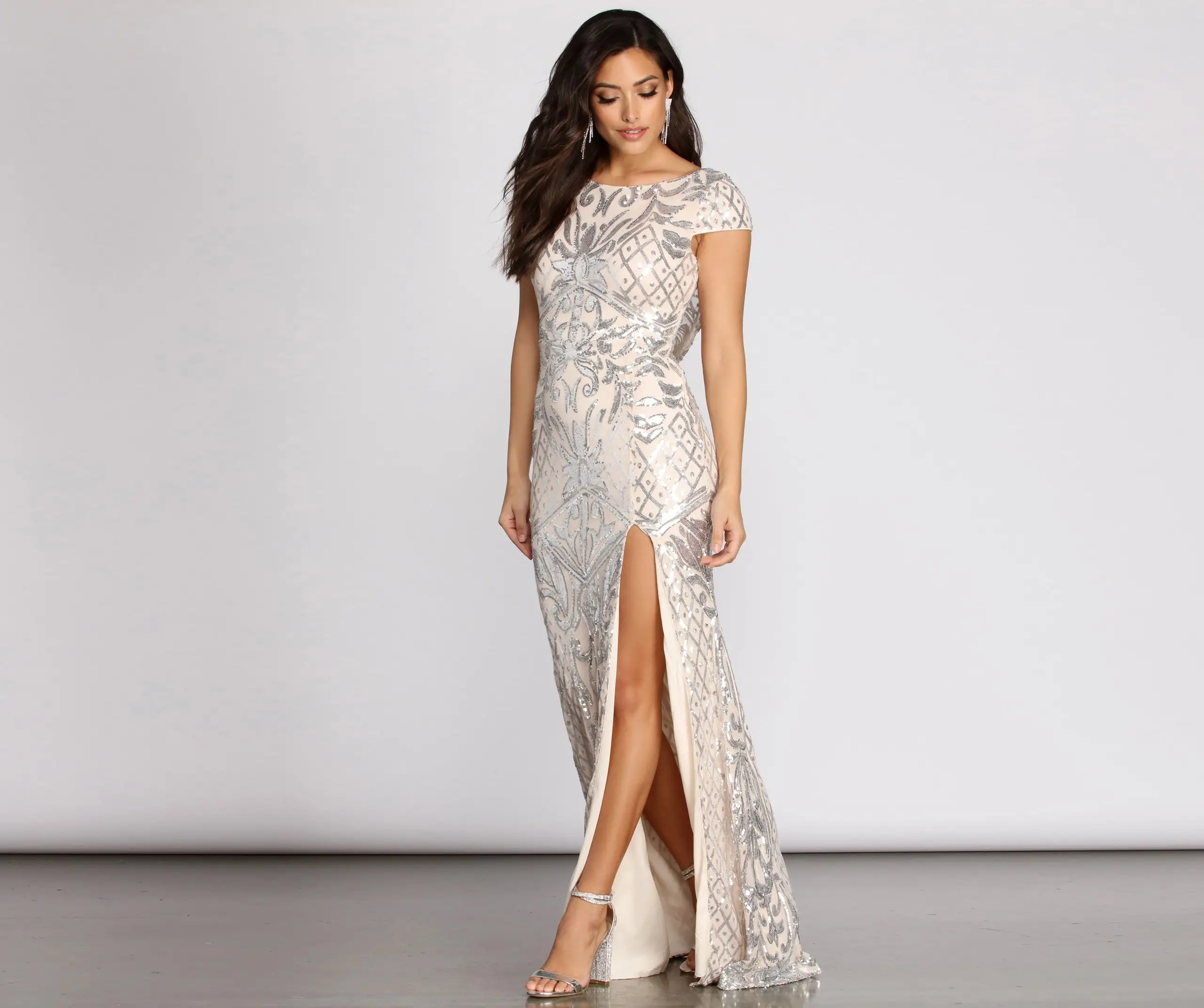 Show off those glistening sequins in our radiating Riva dress! She features a crew neckline, cap sleeves, a chic draped cowl back, a high waist seam, and a floor-sweeping hem with a thigh-high front slit. The sheer mesh fabric has all-over sequin embroidering in a geometric pattern and includes a full knit lining. Complete your look with