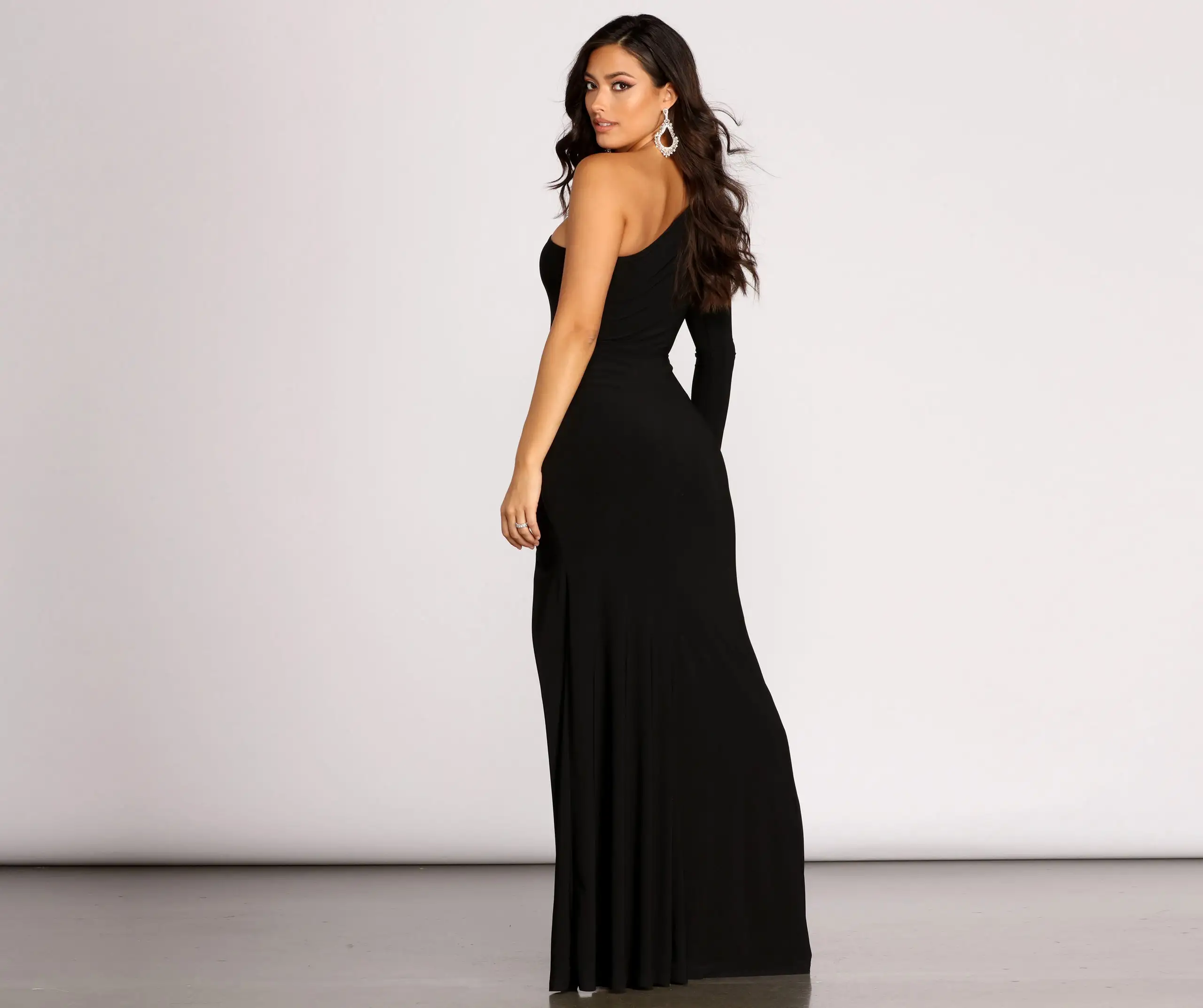 Subtle but dramatic details like Rudy’s singular sleeve, one-shoulder neckline, and thigh-high slit are what elevates this streamlined style. Accentuate your look even more by adding a pair of dangling duster earrings and glistening heels to match!