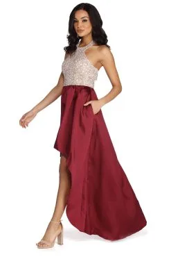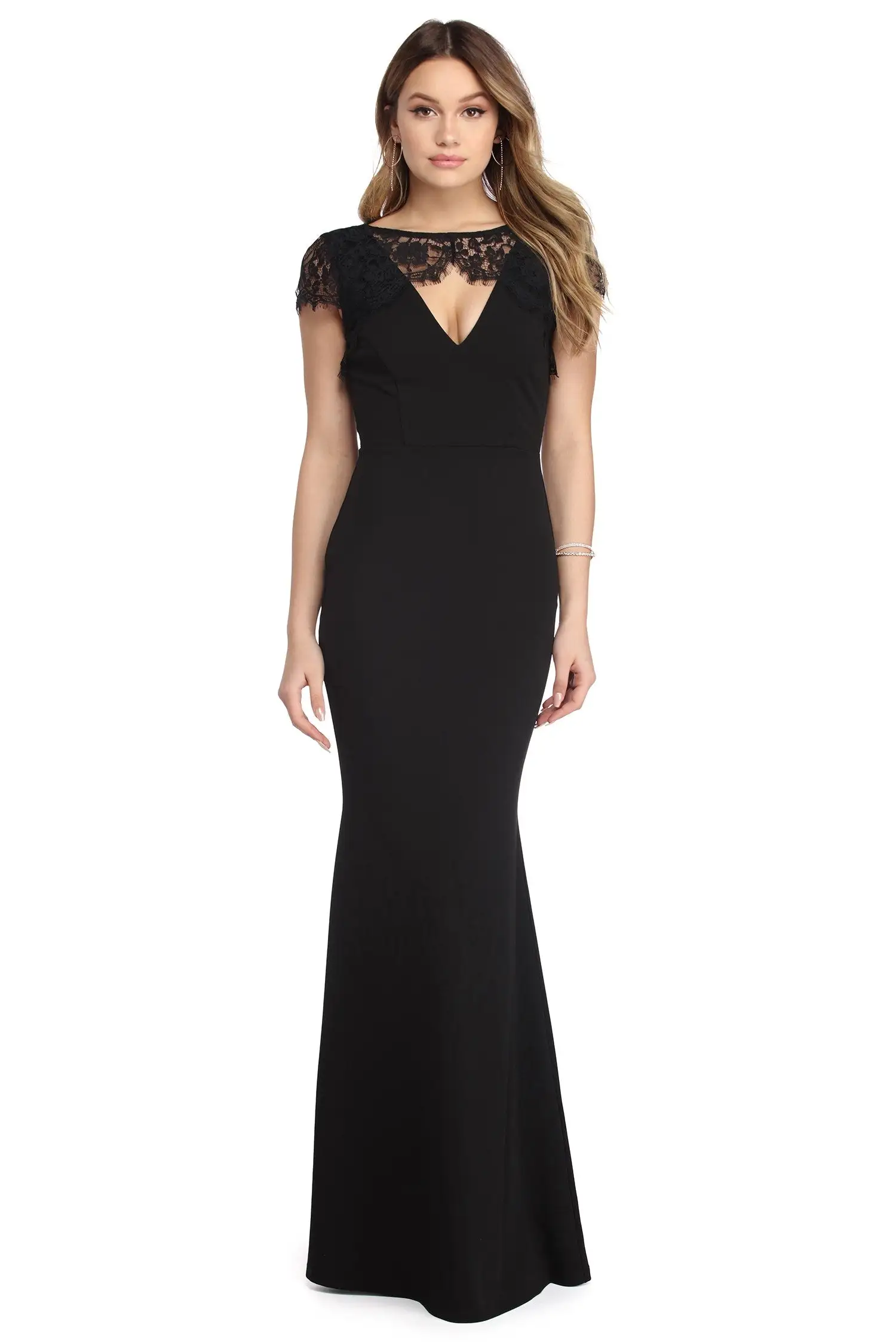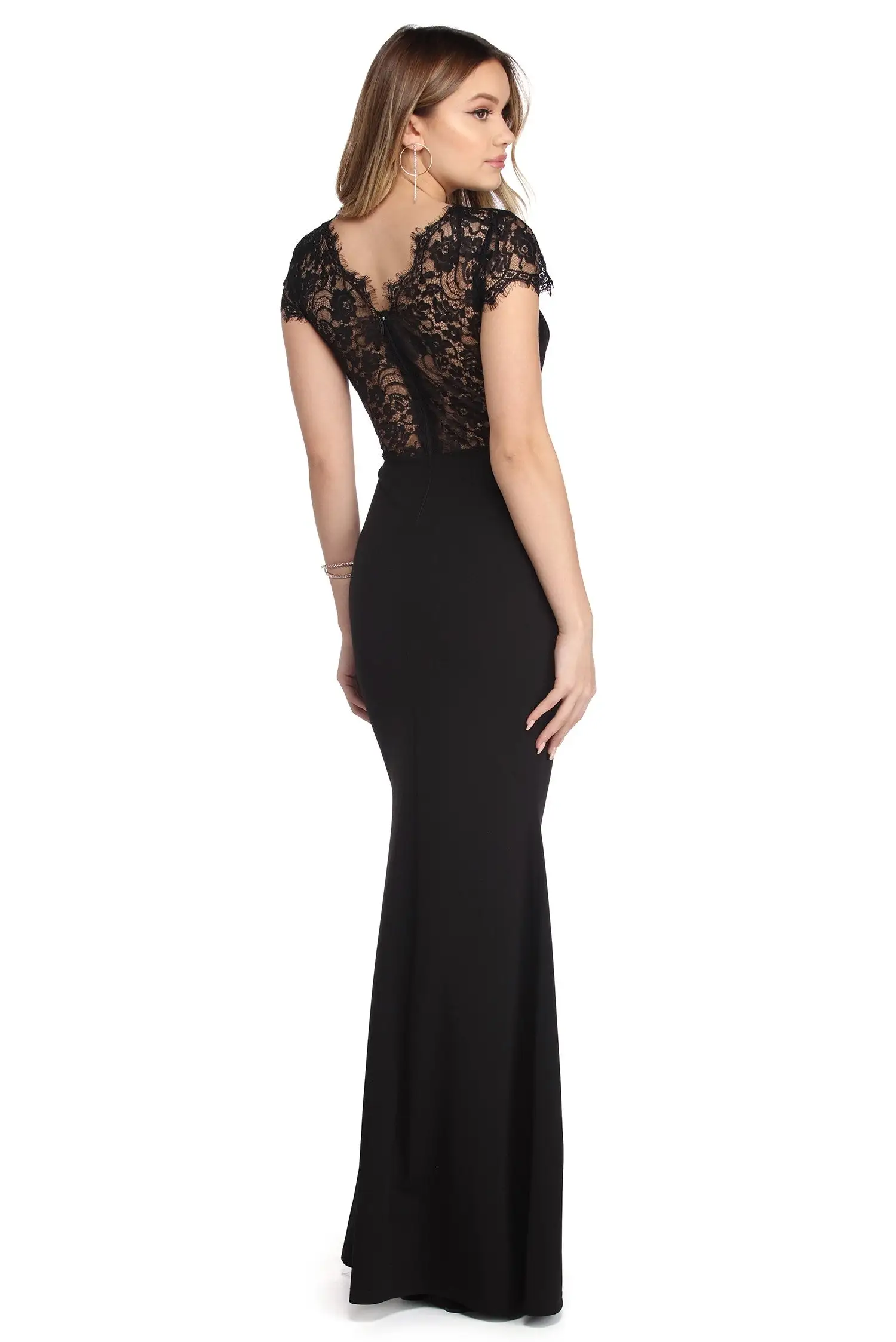 Class up your night with sophisticated lace in our Samantha dress! She features a plunging V neckline, short cap sleeves and flattering princess seams. Her collar features an unlined dainty lace accent that creates a flattering keyhole effect. Her back steals the show with an unlined illusion lace to make a bold statement! Her slim fit bodice leads to a flirty mermaid skirt that adds the perfect pop to your look!