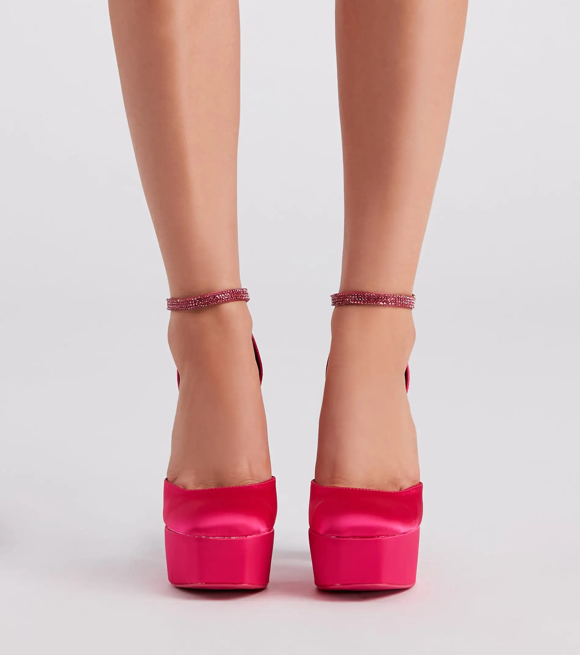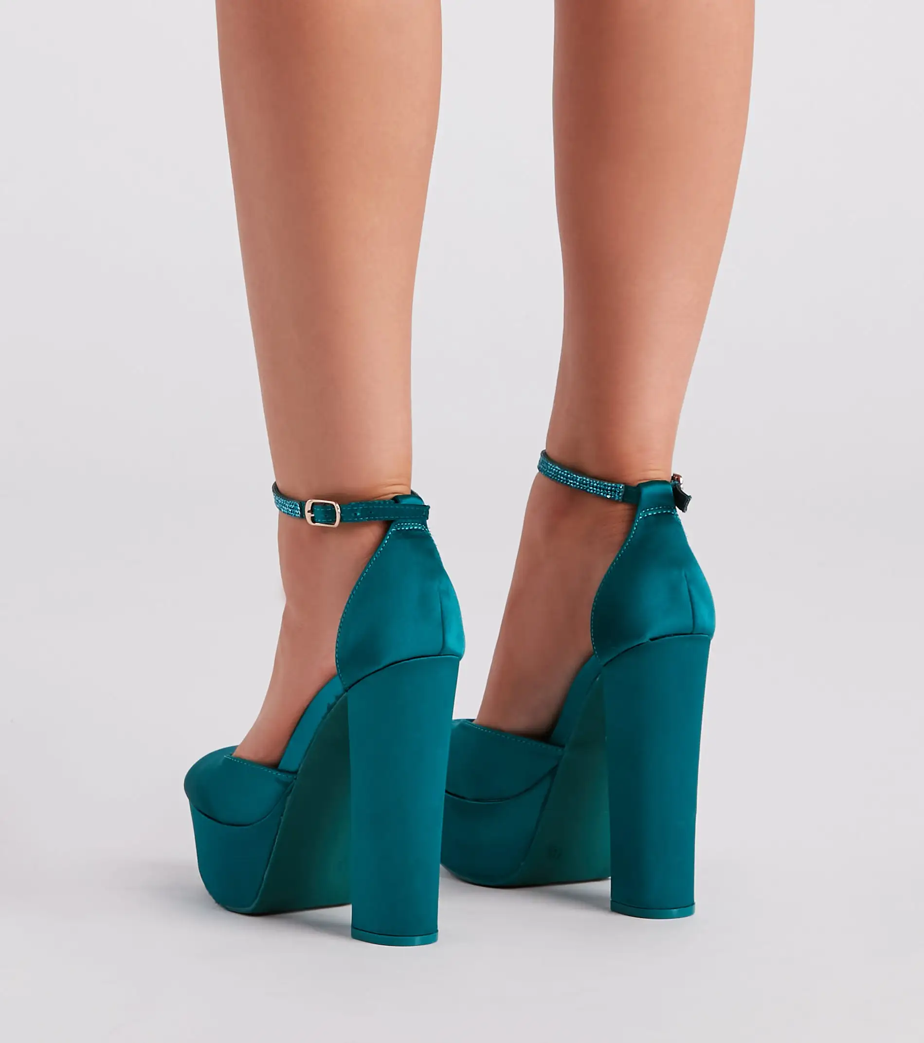 It’s the season to party and you’ll want to look fab for it all! Slip on these sassy satin pumps featuring a sleek closed square toe, a chunky platform sole, block heel, and a closed ankle with a rhinestone embellished strap and buckle closure. Complete the look with a shimmery
