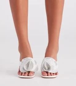 Bring the shine with heels that add that glowing touch to your outfit! The heels feature a zippered back, a rhinestone embellished ankle strap, an asymmetrical multi-strap design with rhinestones, an open square toe, and a block heel. The heels are composed of a glitter mesh material. Complete look with an