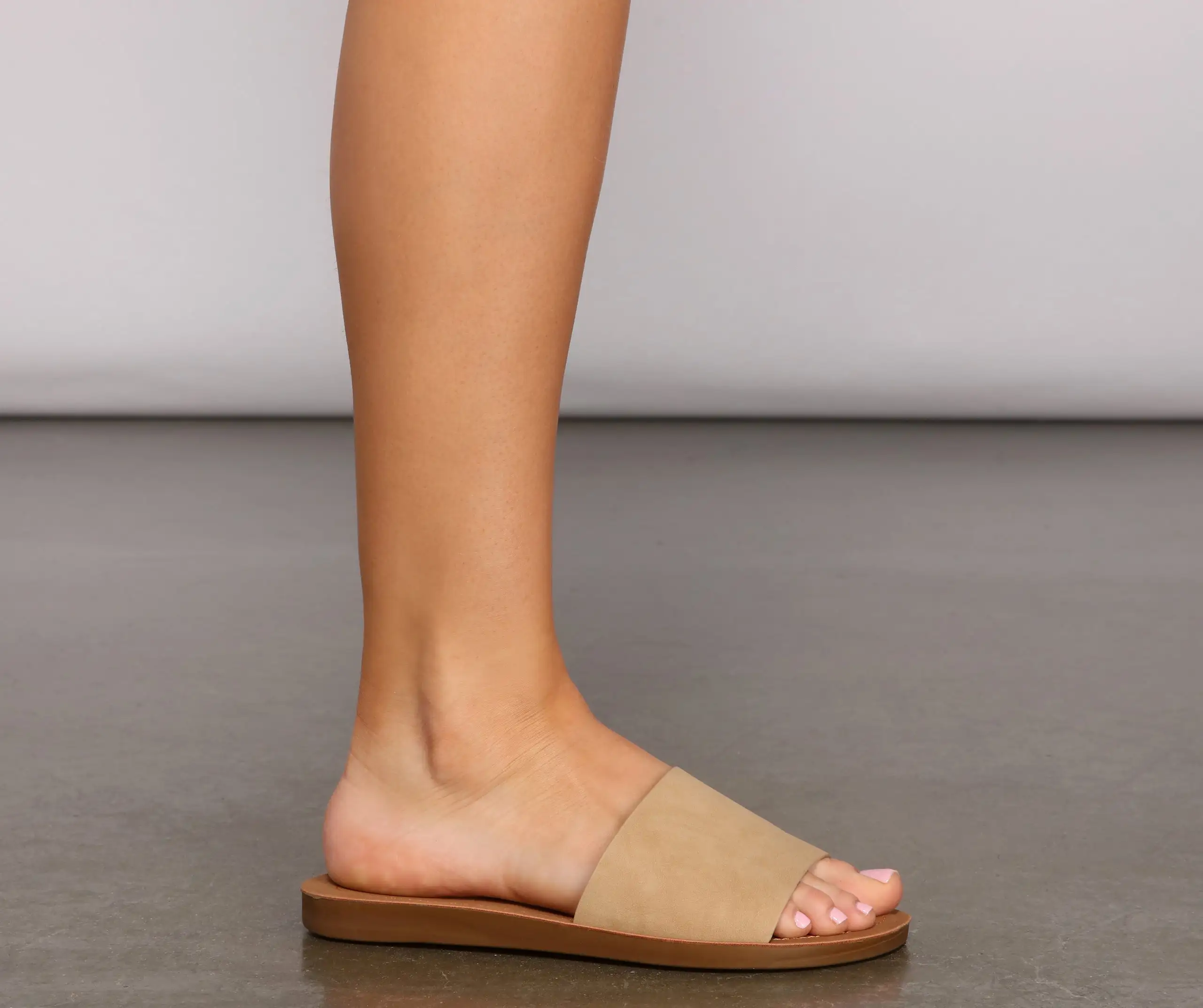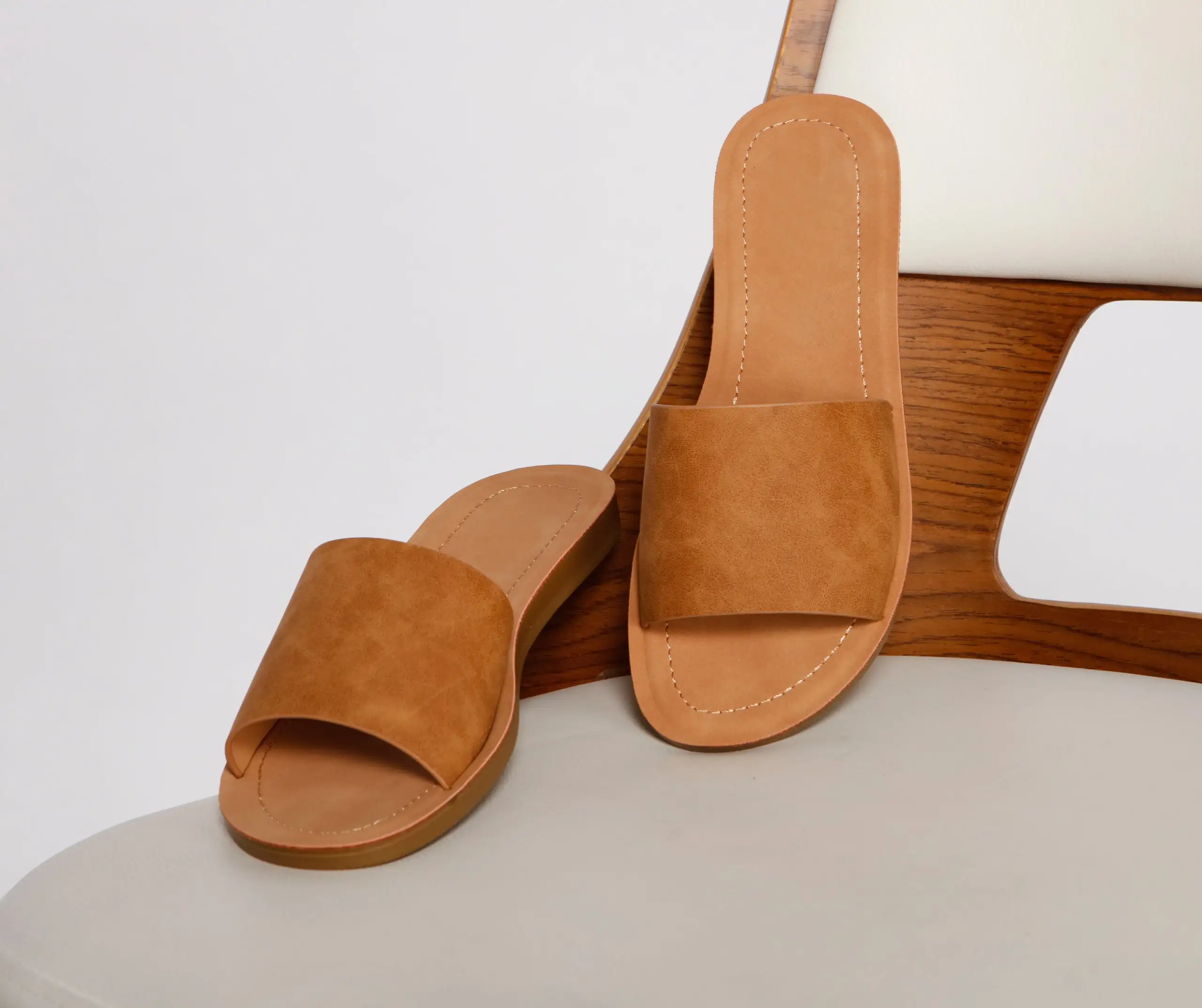 Keep it so sleek with basic sandals that perf for beach days and brunch! The sandals feature a slip-on design and open almond toe with a wide strap over the toe and a faux leather insole. Complete look with a