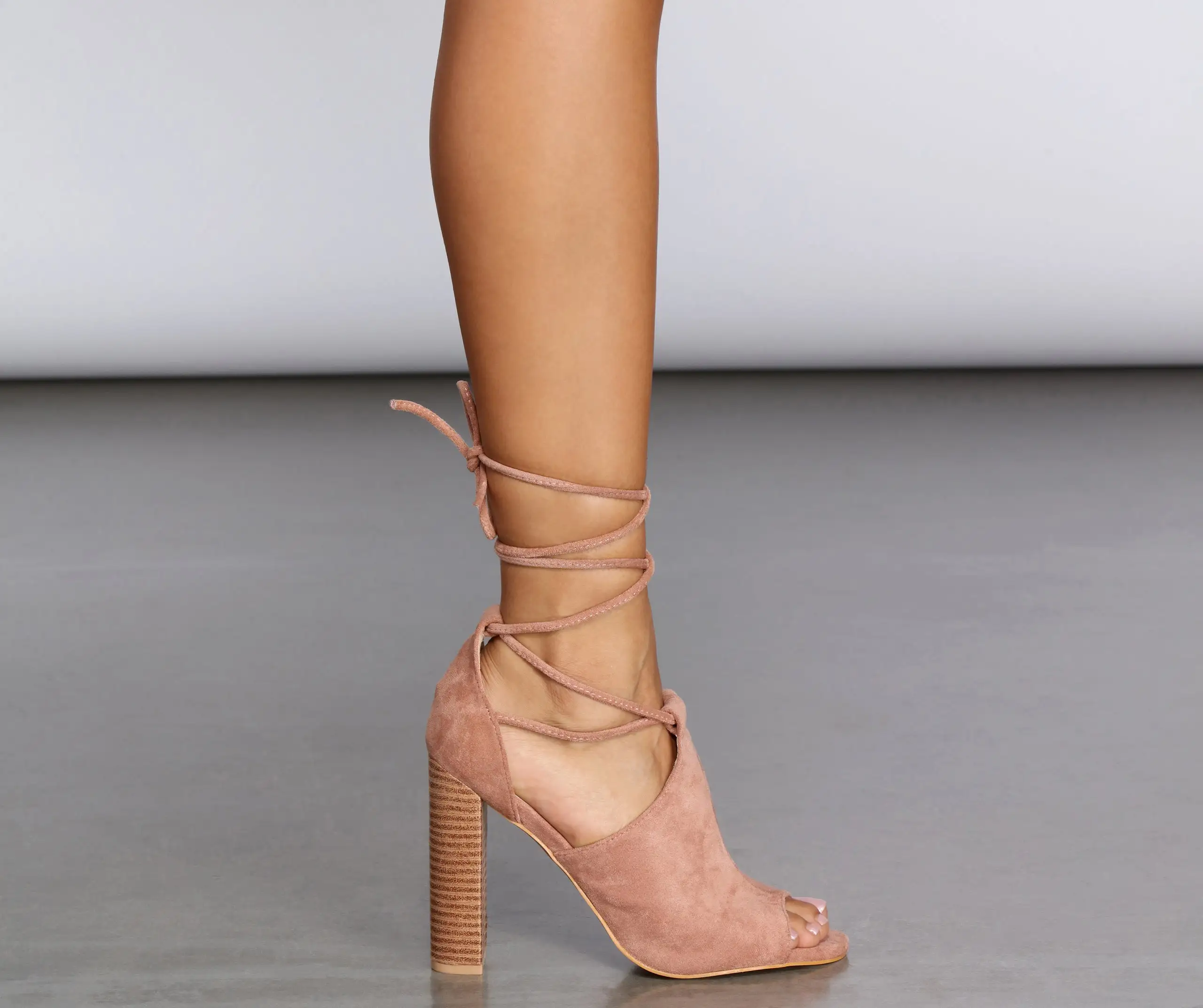 These shoes feature a peep toe, a stacked wood block heel, a partially covered upper, and an adjustable lace-up tie front from ankle to lower calf. Shoes are made from a faux leather material.
