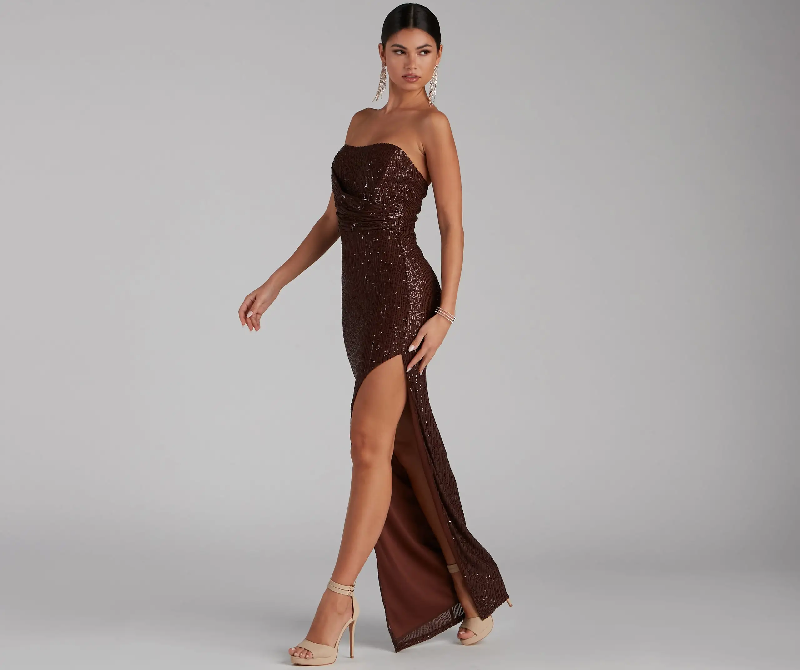 Steal the spotlight in the Sorella formal dress that will have you the best dressed this prom season! She features a strapless, tube design with a wrap corset-style bodice and flexible boning to provide support as you hit the dance floor. Her floor-length hem flows into a sexy high-cut slit. The knit fabric features all-over sequin embroidery for a gorgeous sparkle. Complete your stunning look in