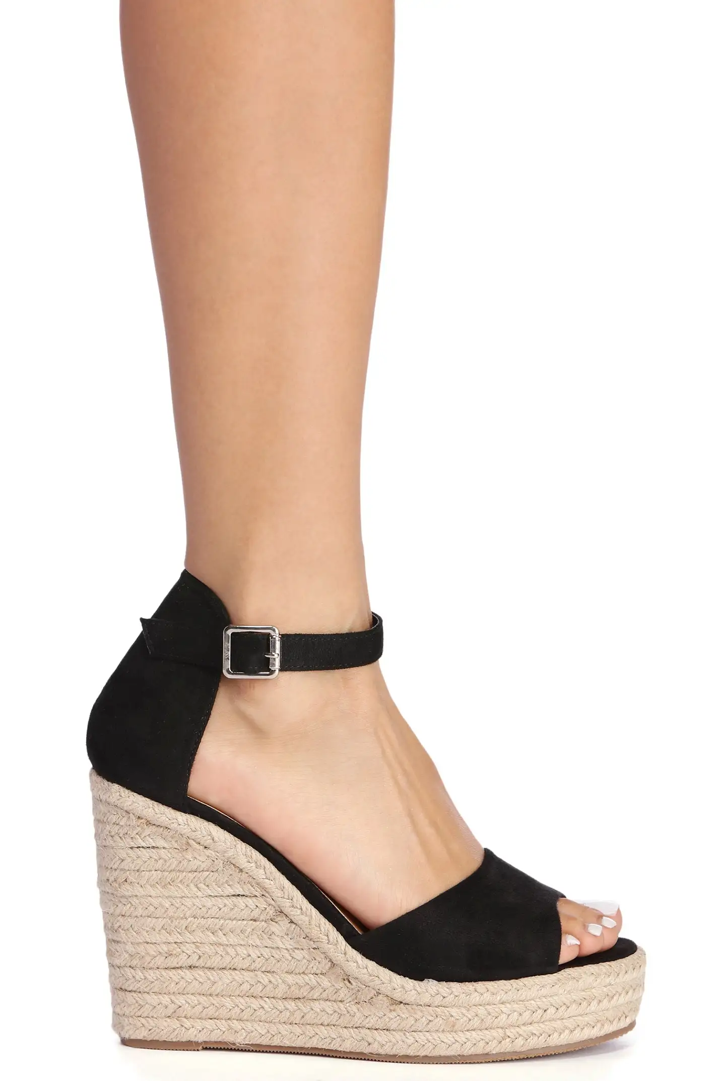 Step up your sandal game with these super cute black and tan espadrille wedges. They feature an open toe, ankle strap with buckle, and a platform wedge heel.