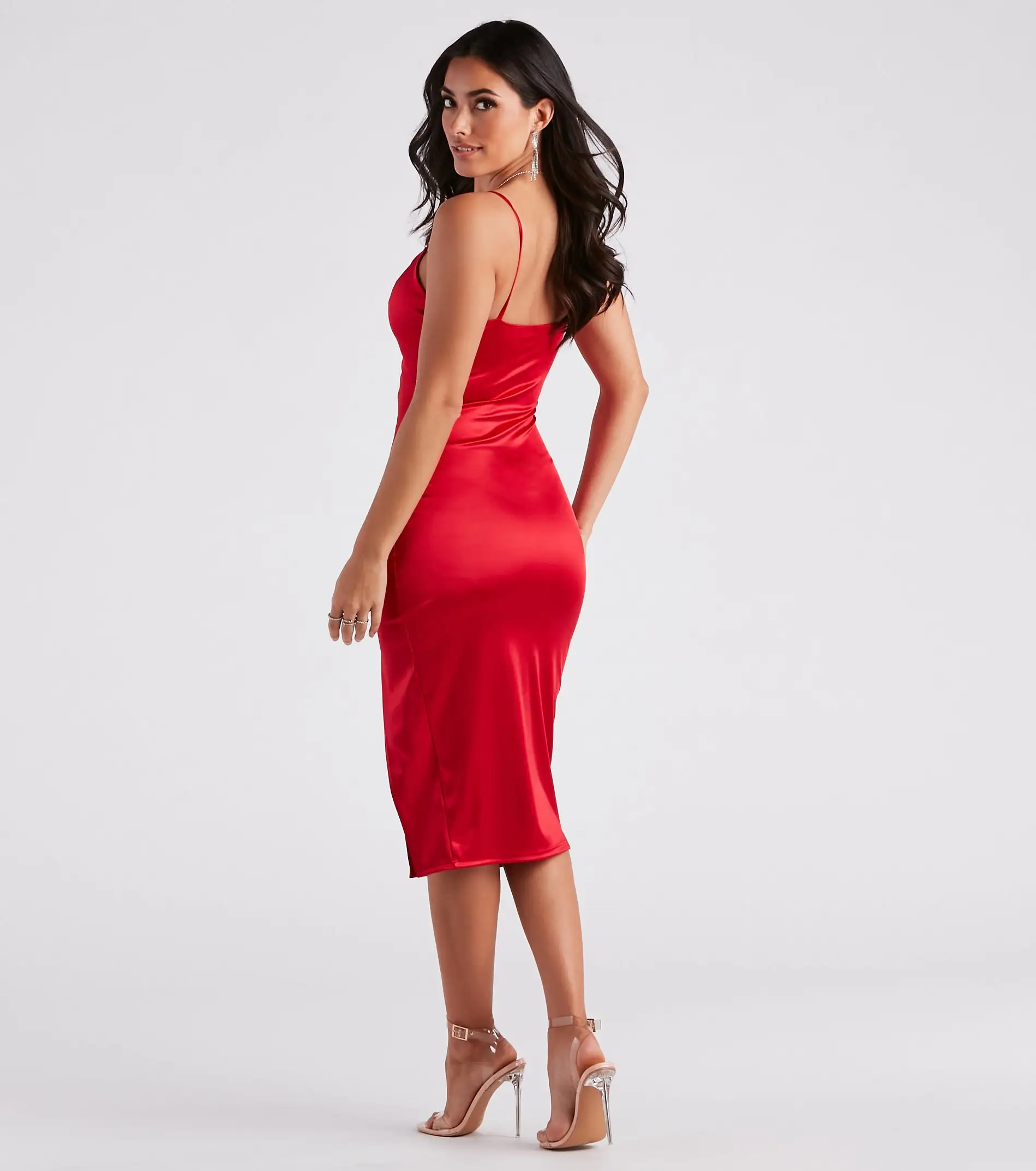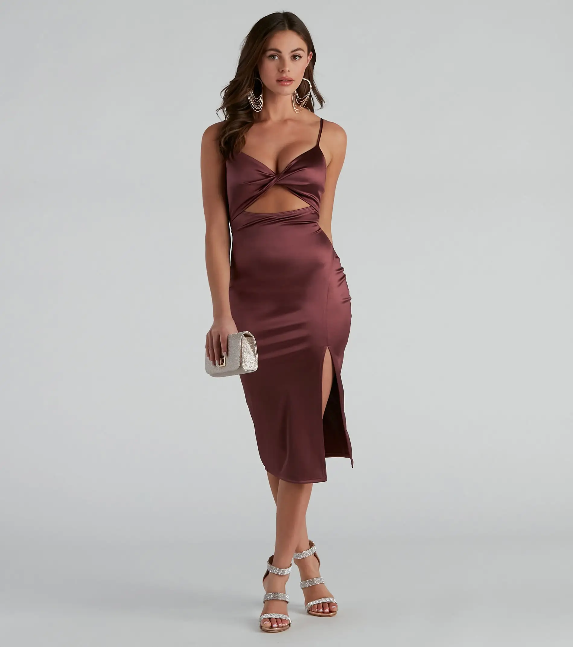 Showcase a stunning sleek style in this alluring midi dress! It features a sleeveless V-neckline with a twist-front design, spaghetti straps, a sultry waist cutout, and a midi-length, curve-hugging silhouette with a high front slit. Complete the look with