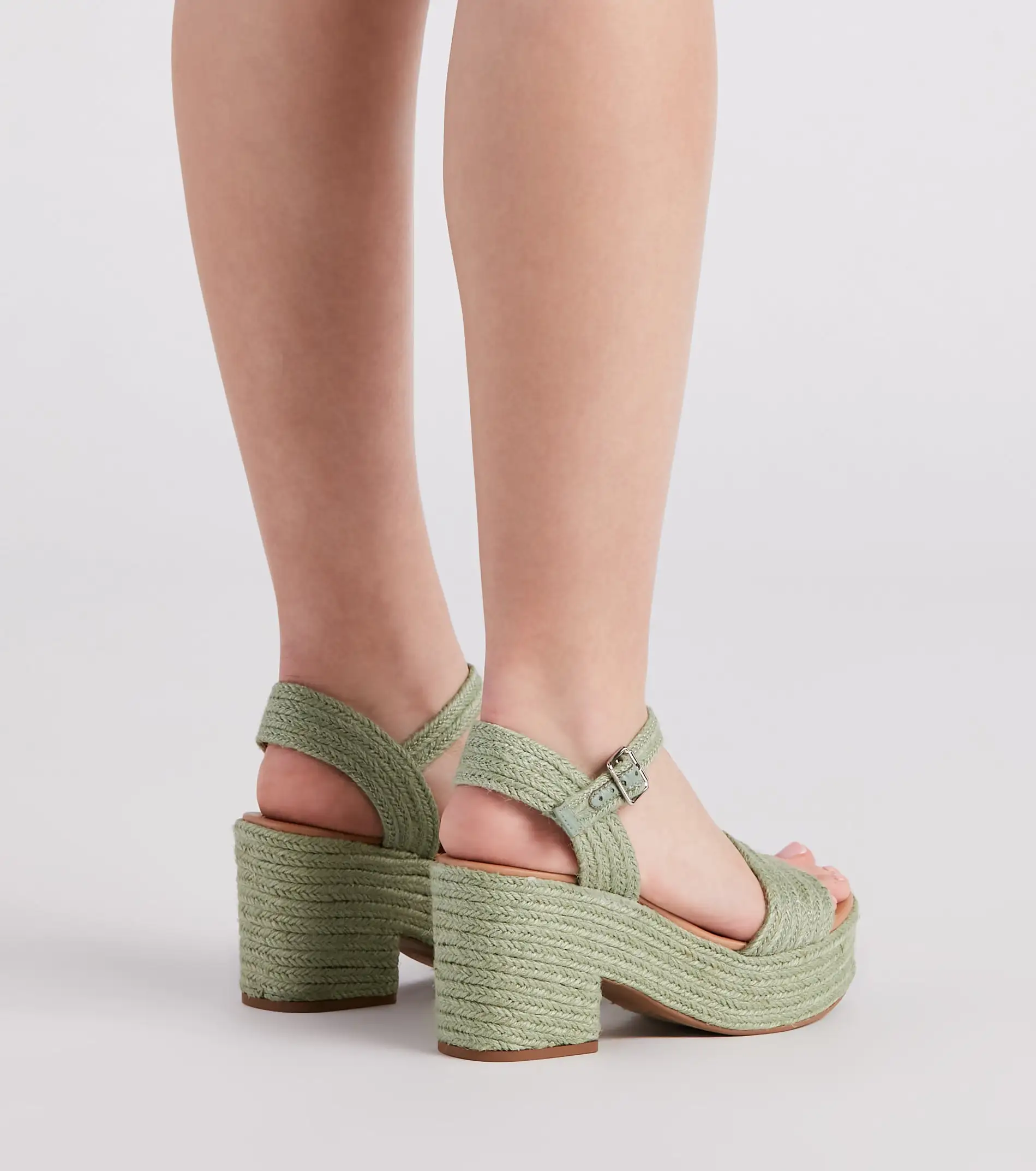 These adorable espadrille platform sandals were made for sunny spring vibes! They feature an open almond-shaped toe, a wide toe strap, an adjustable ankle and heel strap, a platform sole, and a block heel. The sandals are composed of a braided jute material with a faux leather insole. Style with a