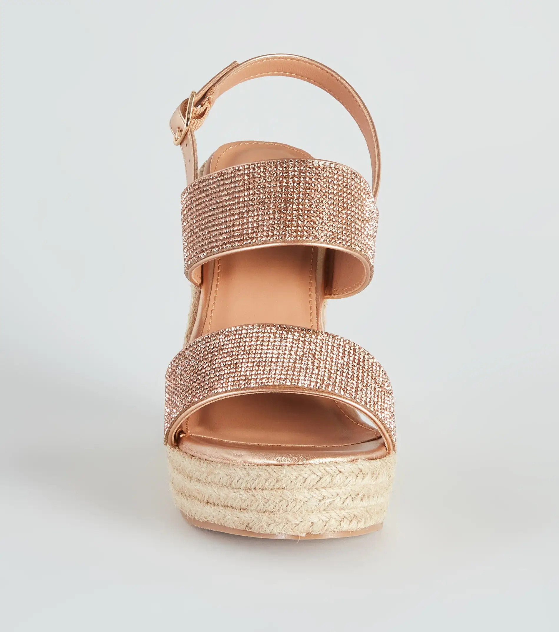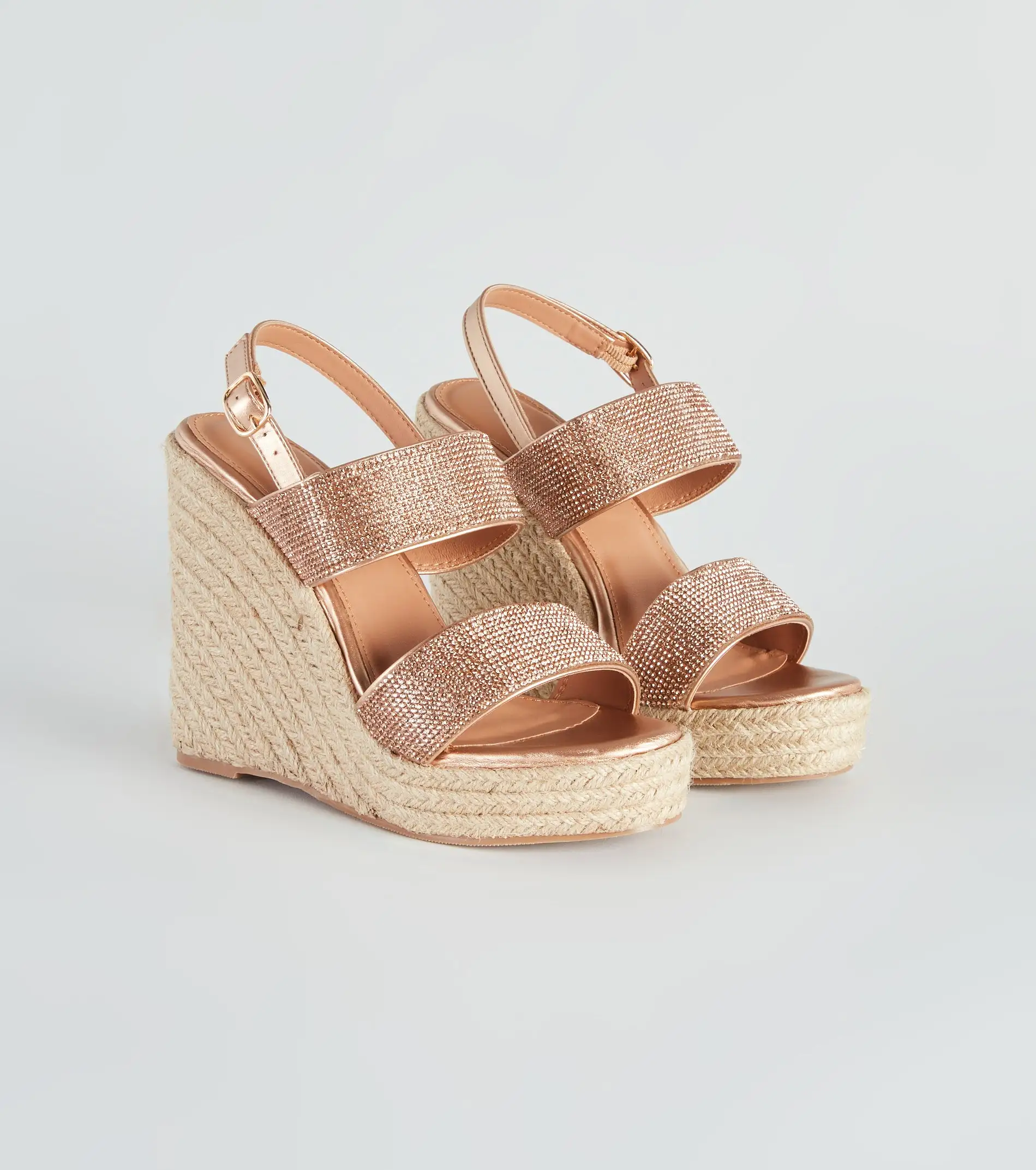 Take luxurious steps on vacation in these glitzy espadrille wedges featuring an almond toe, wide rhinestone straps, a platform sole, and a slingback ankle strap with buckle closure. Style with a chic