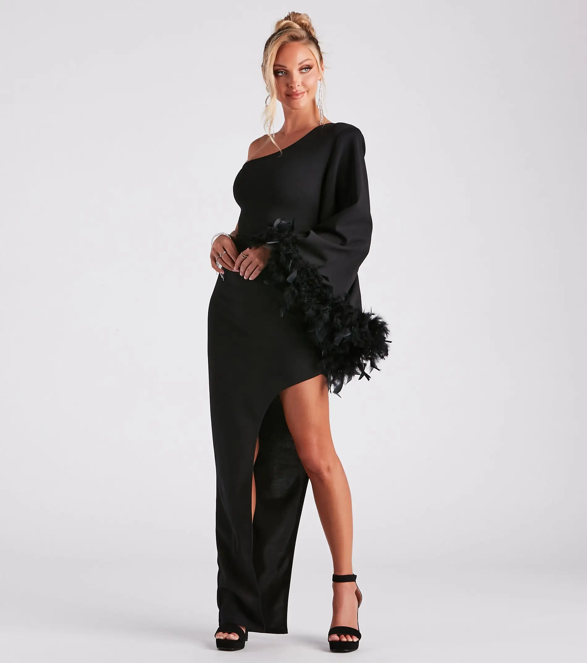 The Vivian formal dress will let you showcase your dramatic chic side! She features a one-shoulder neckline with a shoulder pad to provide structure, a bold long flared sleeve with a trendy feather trim, a floor-length asymmetrical hem creating a thigh-high side slit, and a curve-hugging silhouette. The crepe knit fabric offers a moderate stretch. Style with