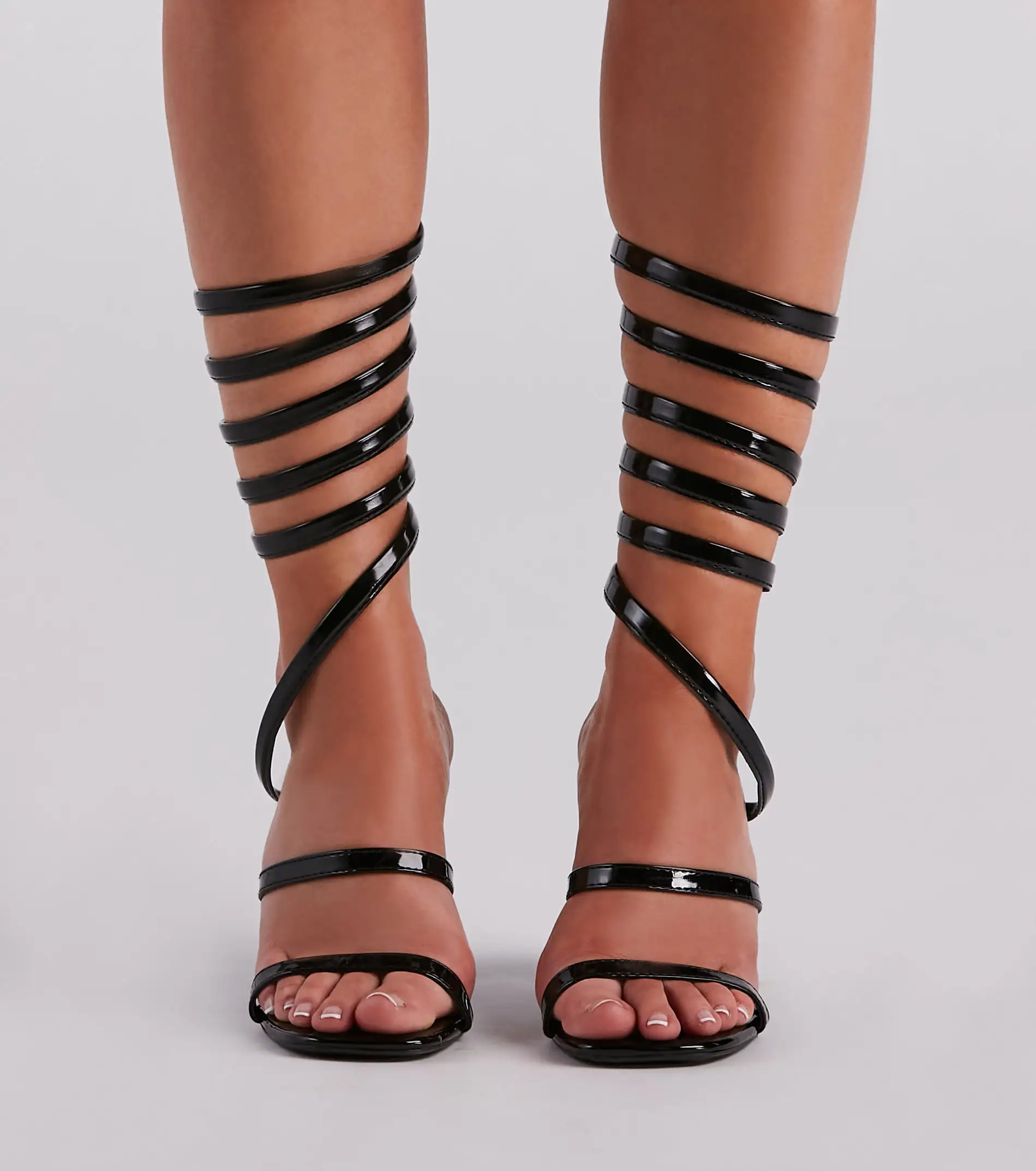 These patent leather block heels are sure to wind you up! They feature a square toe, dual thin straps, and spiral ankle straps with a faux leather footbed. Style with a