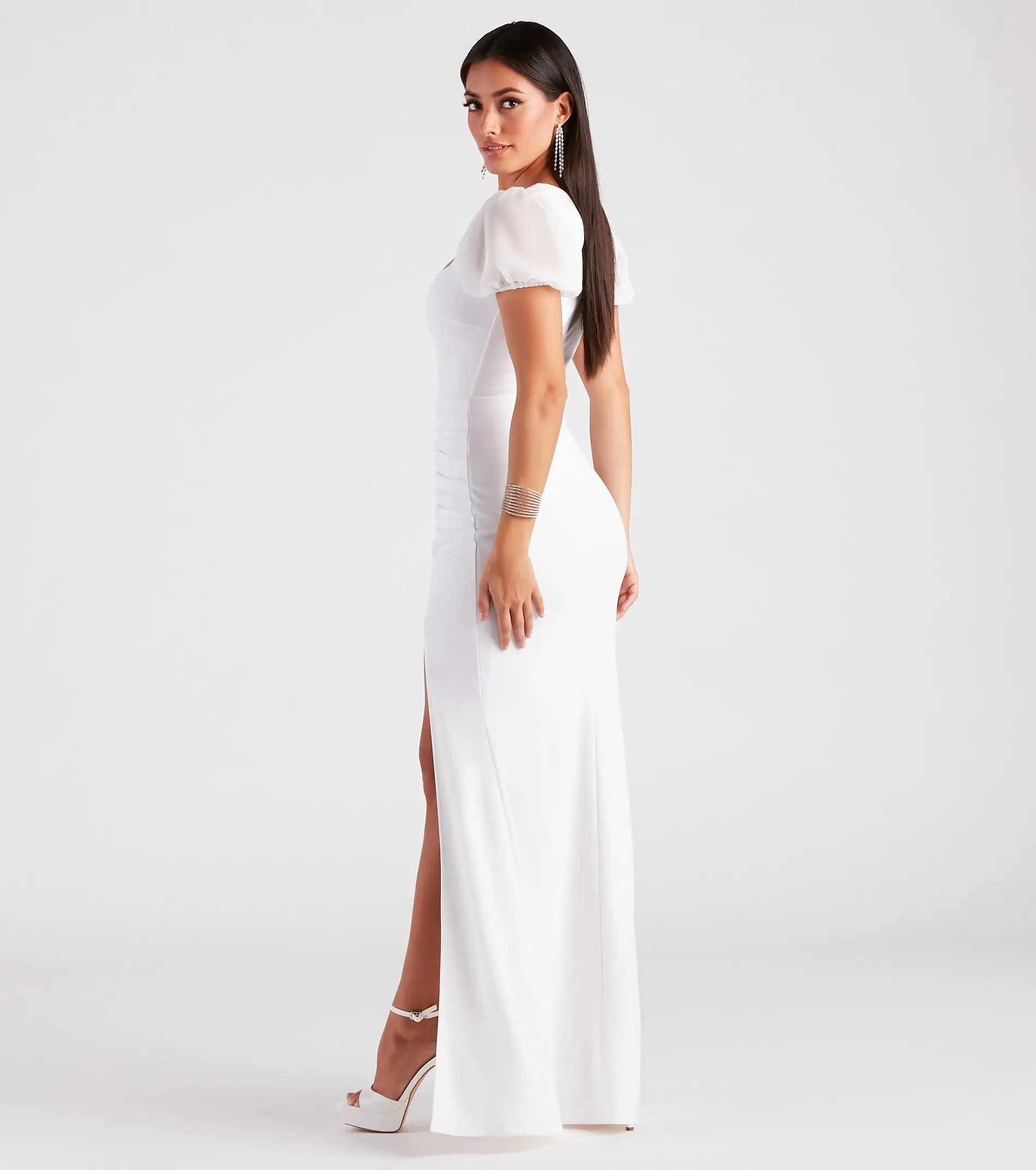 Sweet and demure, the Zoie formal crepe dress is all about effortless elegance! A breathtaking style for brides, graduates, and formal birthdays. She features sheer mesh puff sleeves, a square neckline, a front ruched seam atop a sultry slit, and a flattering mermaid silhouette with a floor-length hem. The formal dress is composed of a crepe fabric with sewn-in knit lining and a moderate stretch. Complete the look in chic